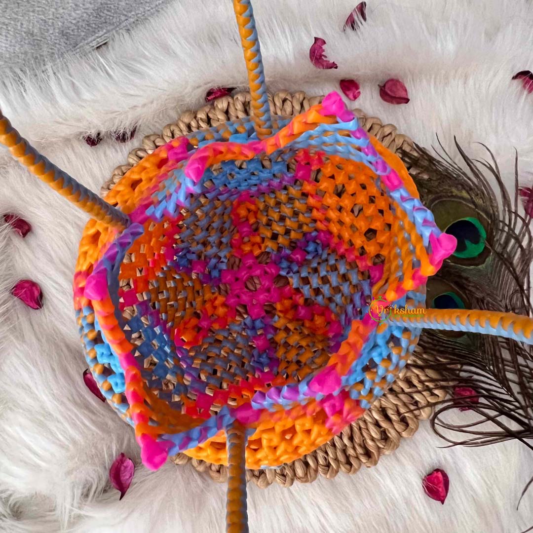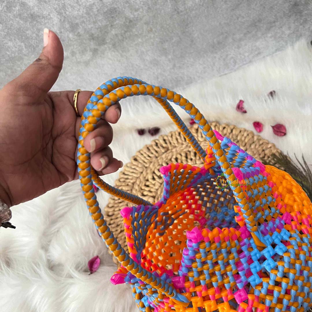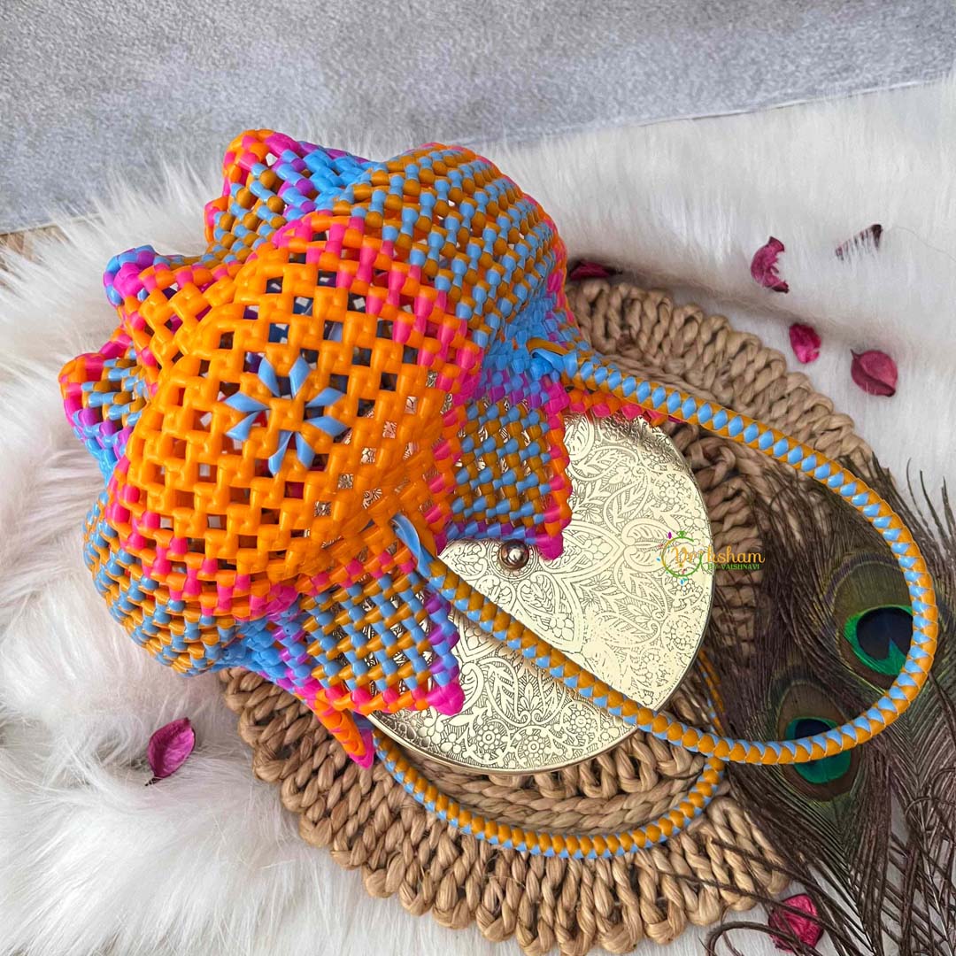 Celebrate heritage craftsmanship with this authentically designed traditional Indian wire koodai featuring a vibrant tri-color palette of orange, blue, and pink. The distinctive pointed zig-zag rim design adds architectural interest and cultural authenticity, honoring time-honored artisanal techniques. Crafted from durable wire materials, this koodai combines aesthetic richness with exceptional structural integrity and practical functionality. The generous capacity accommodates daily essentials while the intricate rim detailing showcases meticulous attention to traditional design elements. The bold color combination reflects the vibrancy of Indian artistic heritage while remaining versatile for contemporary lifestyles. Perfect for the discerning individual who values cultural authenticity and artisanal excellence, this koodai transcends conventional accessories to become a meaningful investment piece that celebrates traditional craftsmanship with enduring style and distinctive cultural sophistication.