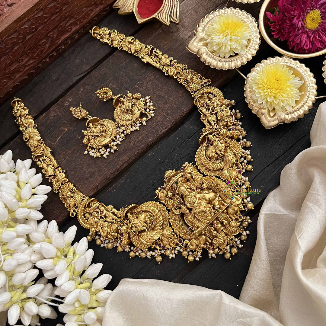 The Vriksham Traditional Kamdhenu & Krishna Idol Gold Toned Long Neckpiece features intricate motifs of Kamdhenu and Lord Krishna, thoughtfully accented with gold beads and lustrous pearls. This sophisticated piece embodies cultural heritage and elegance, making it a distinguished accessory for festive and ceremonial occasions.