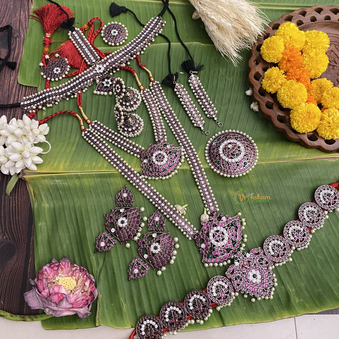 Indulge in timeless elegance with the Vriksham Traditional Kemp Bridal Set. Crafted with delicate craftsmanship and intricate designs, this set is perfect for a luxurious and exclusive wedding look. Adorned with glowing kemp stones, it exudes sophistication and opulence, making it the perfect choice for the modern bride.