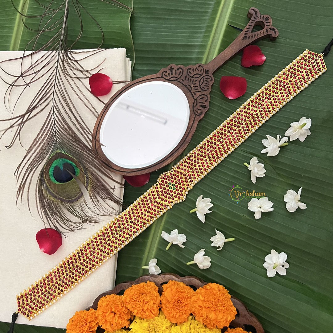 The Vriksham Traditional Kemp Cross Line Hipbelt in red and green, accented with pearls, features a refined cross line design that blends classic style with intricate detailing. This elegant accessory adds a sophisticated touch to traditional attire, enhancing your ensemble with timeless charm and subtle grace.