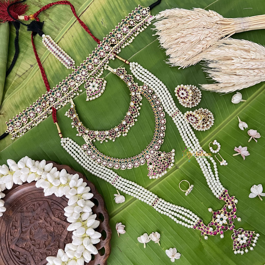 The Vriksham Traditional Kemp Gold Plated Bridal Set with pearls offers a perfect blend of classic elegance and timeless beauty. Expertly crafted with rich gold plating and adorned with delicate pearls, this set enhances your bridal look with a regal touch. Its intricate kemp design reflects heritage artistry, making it an exquisite choice for a sophisticated and memorable celebration.