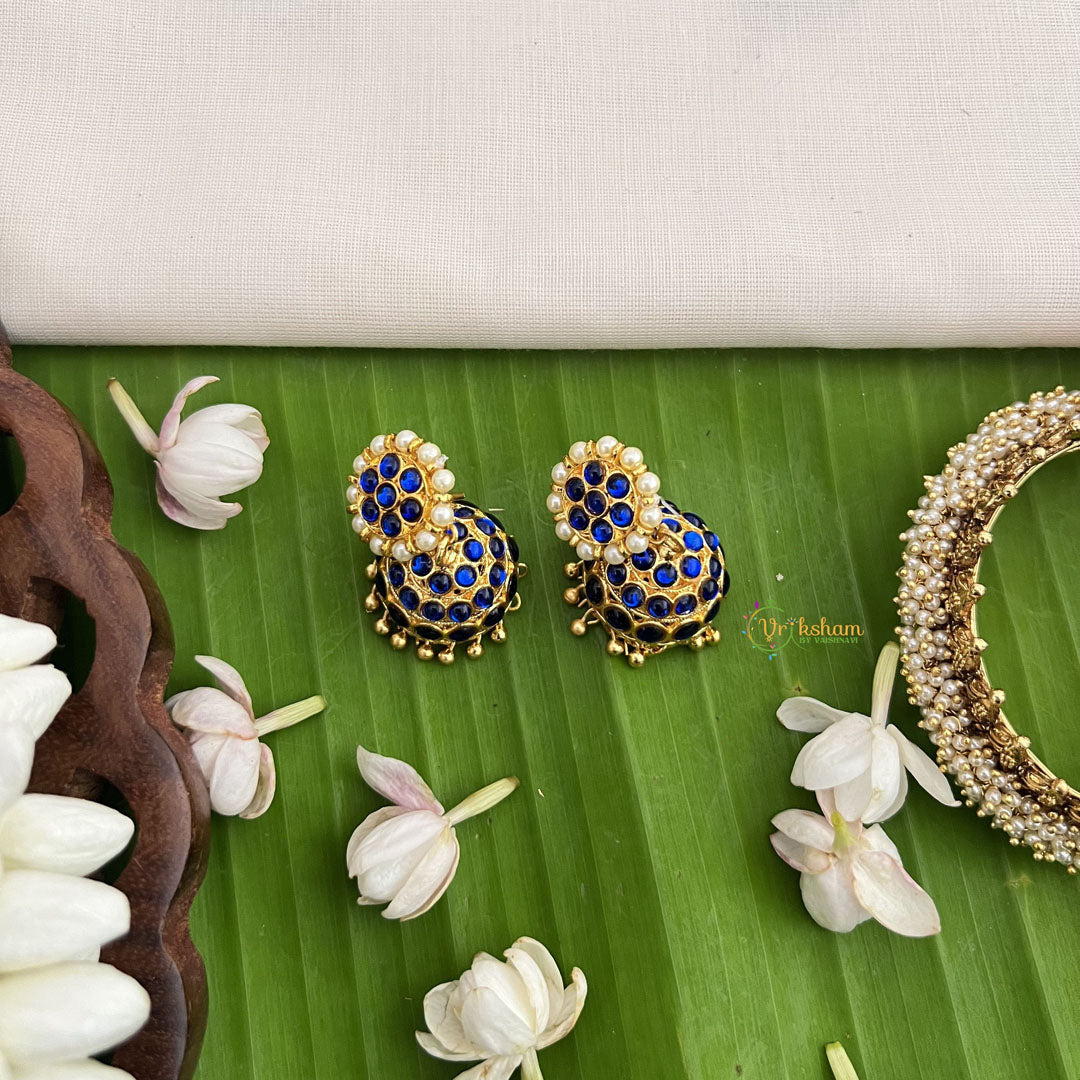 The Vriksham Traditional Kemp Jhumkas in small size feature elegant blue stones paired with delicate pearls. Their refined design and intricate craftsmanship make these earrings a sophisticated choice to complement both traditional and modern styles with subtle grace.