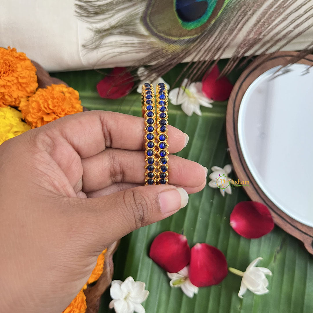 The Vriksham Traditional Kemp Premium Bangle in blue features a striking combination of red and green Kemp stones set against a rich blue backdrop. This sophisticated piece blends vibrant colors with expert craftsmanship, making it an elegant accessory to enhance your traditional and festive attire.