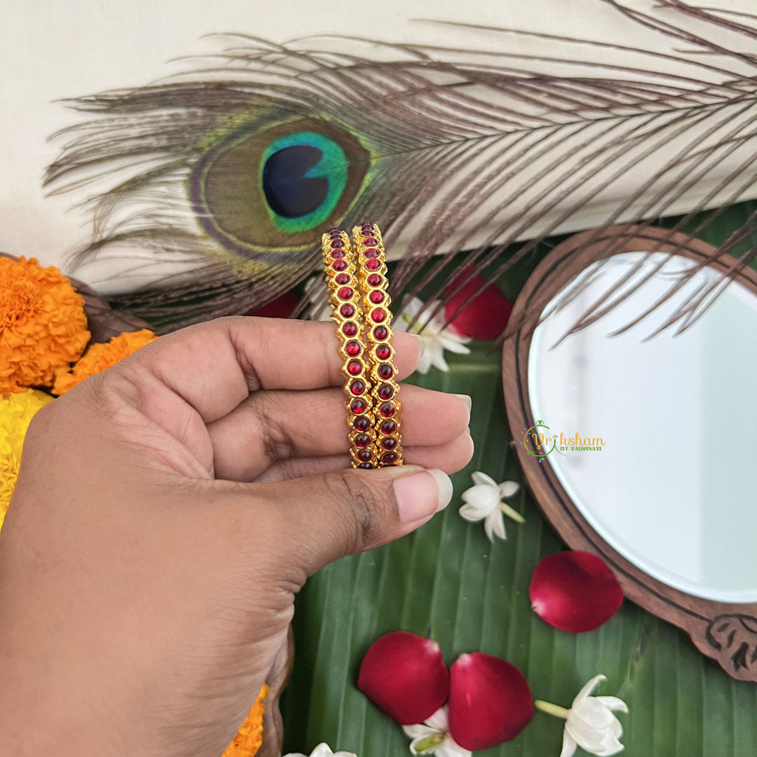 The Vriksham Traditional Kemp Premium Bangle in red features a harmonious blend of red and green Kemp stones, meticulously crafted to elevate your traditional attire. This elegant bangle offers a sophisticated accent, perfect for adding timeless charm to your festive or special occasion ensemble.