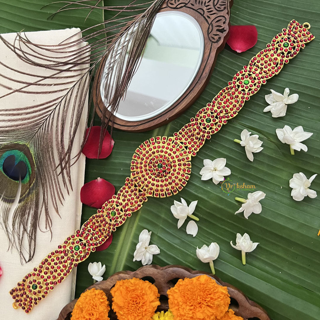 Elevate your ensemble with the Vriksham Traditional Kemp Round Pendant Hipbelt in a rich green enamel finish. This exquisite piece blends classic craftsmanship with contemporary style, featuring a striking round pendant that adds a refined touch to any outfit. Perfect for those who appreciate timeless elegance, this hipbelt offers both beauty and versatility, enhancing your look with subtle sophistication.