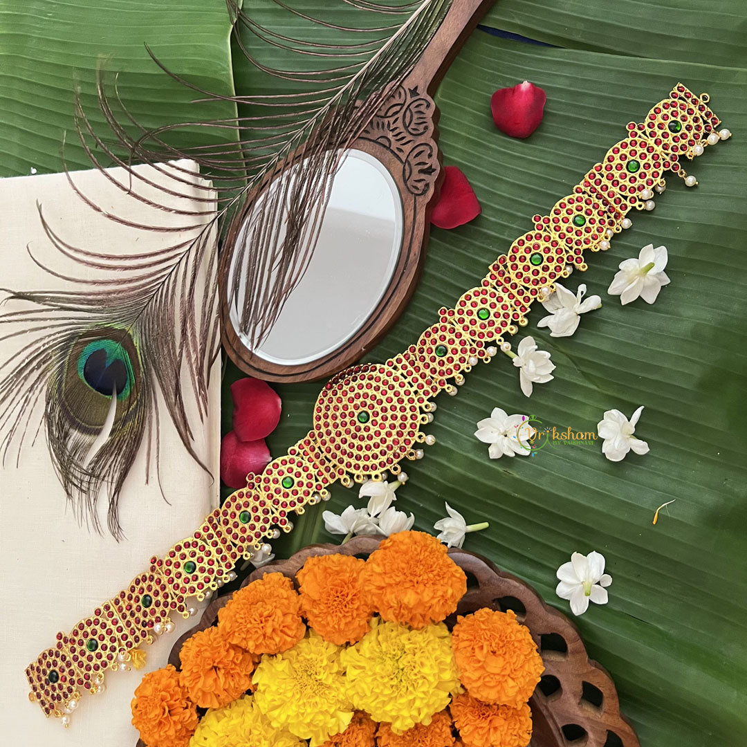 Elevate your traditional attire with the Vriksham Traditional Kemp Round Style Hipbelt in rich red and green hues accented by lustrous pearls. This intricately crafted hipbelt blends classic design with refined elegance, making it a perfect accessory to enhance your festive or ceremonial ensemble. Its timeless appeal and meticulous detailing offer a sophisticated touch that complements your cultural wardrobe beautifully.