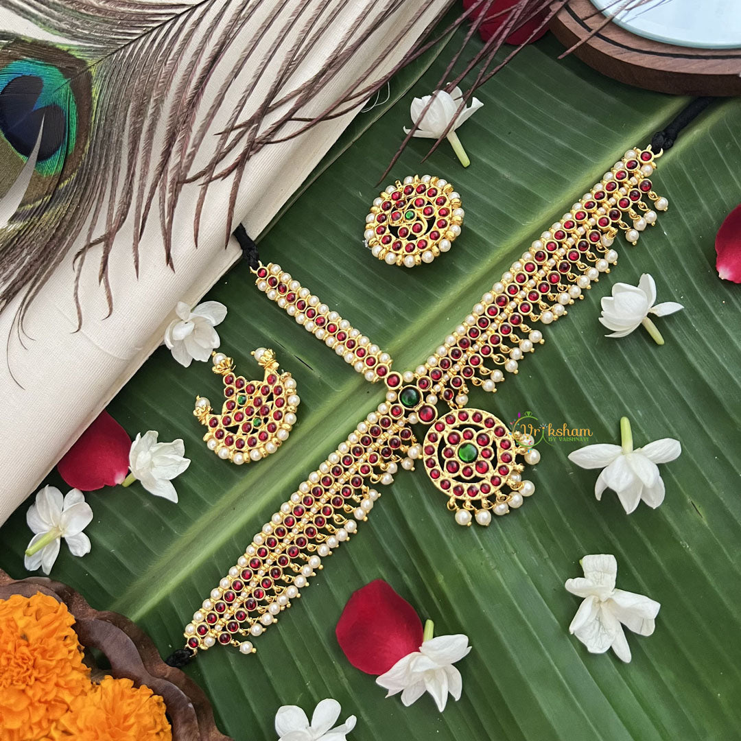 The Vriksham Traditional Kemp Round Tikka features a classic round design adorned with vibrant red and green kemp stones, enhanced by delicate Chandran Suriyan pearls. This finely crafted gold-plated piece offers a sophisticated touch to traditional attire, making it an elegant choice for special occasions.