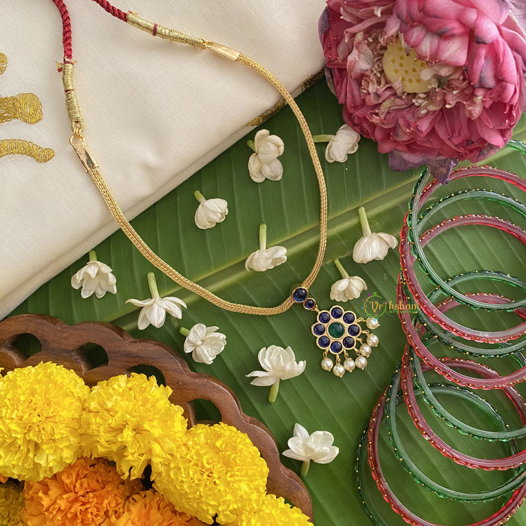 Indulge in luxury with Vriksham's Traditional Kemp Stone Floral Pendant Short Neckpiece. The intricate design and vivid blue and green colors evoke feelings of regality, while the pearl detailing adds a touch of elegance. Elevate your style and make a statement with this exclusive accessory.