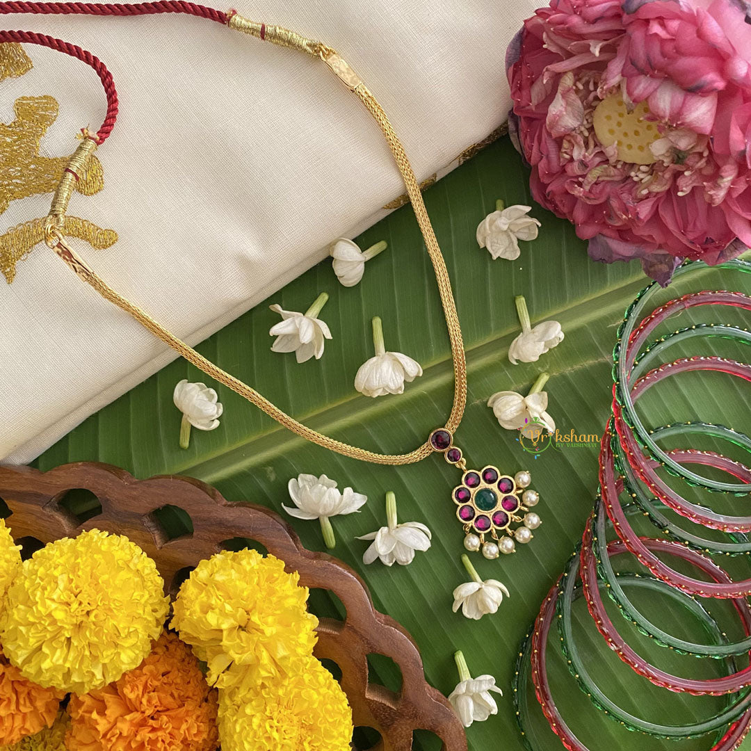 Indulge in luxury with Vriksham's Traditional Kemp Stone Floral Pendant Short Neckpiece. The intricate design and vivid red and green colors evoke feelings of regality, while the pearl detailing adds a touch of elegance. Elevate your style and make a statement with this exclusive accessory.