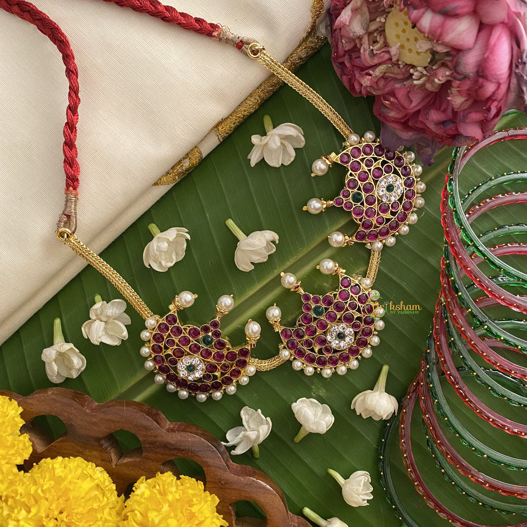Indulge in the opulence of Vriksham's Traditional Kemp Stone Half Moon Style Choker. The intricate design and premium quality Kemp stones exude sophistication and luxury. Elevate any outfit with this exclusive accessory that is reminiscent of the moon's graceful curves. Unleash your inner goddess with this exquisite choker.