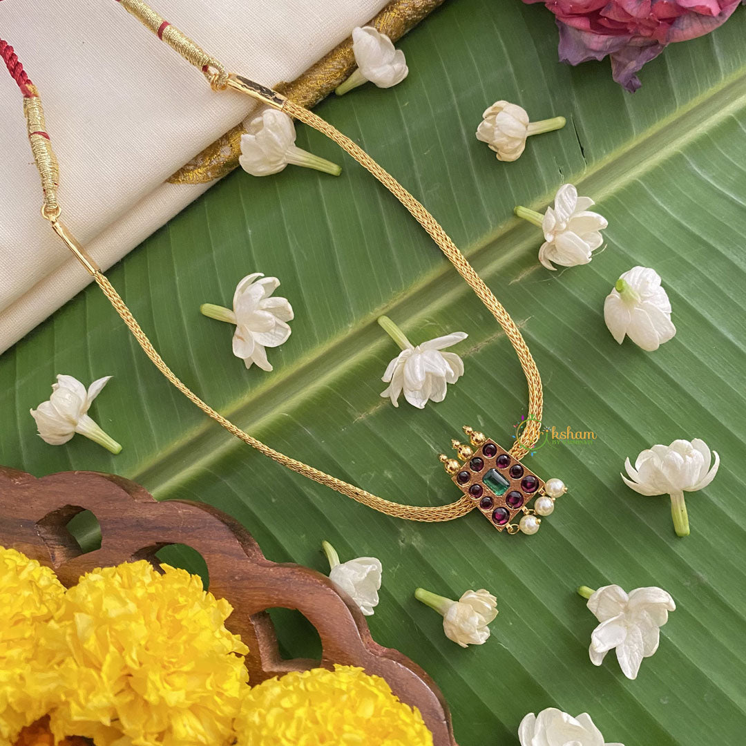 Elevate your style with the Vriksham Traditional Kemp Stone Single Pendant Addigai. This exquisite piece features intricate details and a shimmering kemp stone that will add a touch of luxury to any outfit. Indulge in the exclusive and timeless design of this pendant.