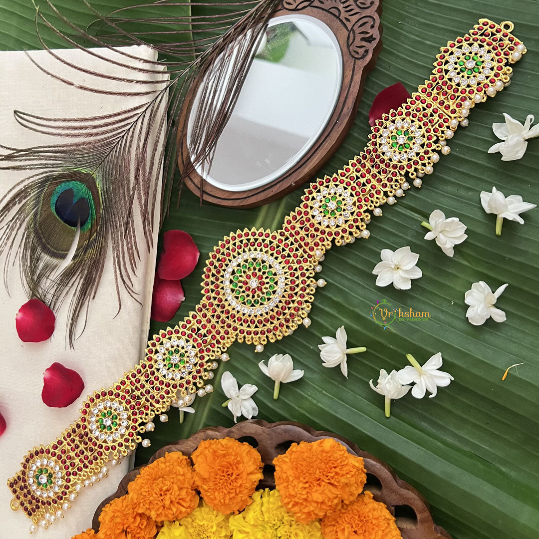 The Vriksham Traditional Kemp Hipbelt features antique gold plating combined with red, green, and white pearls, creating a vintage charm centerpiece. This sophisticated accessory blends timeless elegance with intricate craftsmanship, making it an exquisite addition to traditional attire that enhances your ensemble with classic beauty and refined grace.
