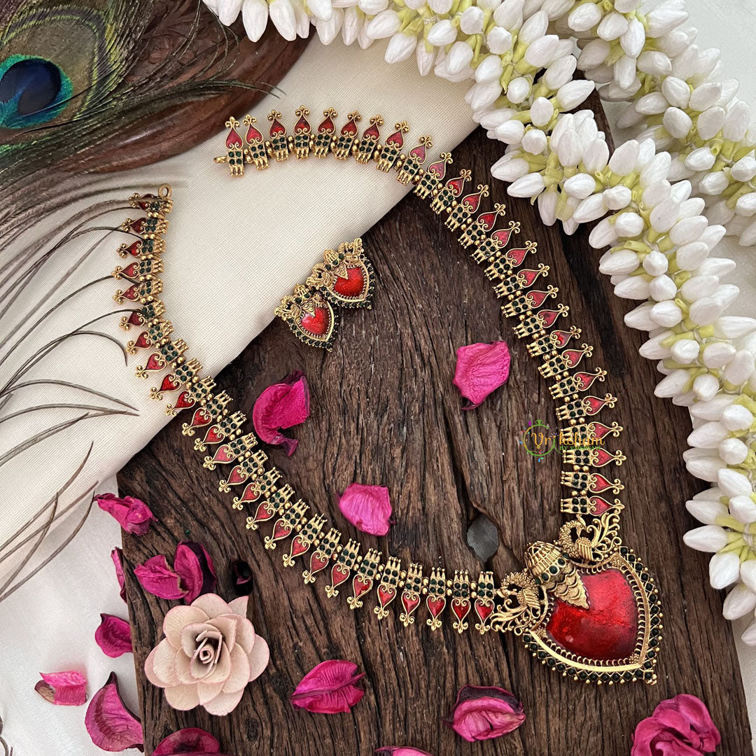 The Vriksham Traditional Kerala Palakka Long Neckpiece in red embodies timeless elegance with its intricate design inspired by Kerala’s cultural artistry. This long neckpiece, rich in vibrant red tones, adds a sophisticated flair to any traditional or modern outfit. Perfect for festive occasions and celebrations, it enhances your look with a graceful blend of heritage and style. Experience refined beauty with this exquisite accessory that honors tradition while making a bold statement.