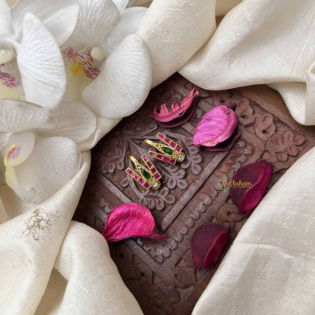 Experience the allure of heritage with this exquisite traditional bugadi, inspired by the sacred symbolism of the diya. This refined accessory features meticulous kundan jadau craftsmanship, adorned with a harmonious blend of red, green, and white gemstones that create a luminous, multi-dimensional effect. The gold-plated base provides a luxurious foundation for the intricate stonework, while the press design ensures comfortable, all-day wearability. Perfect for weddings, religious ceremonies, and festive occasions, this bugadi embodies the essence of Indian artisanal excellence. A treasured piece that honors tradition while making a sophisticated style statement.
