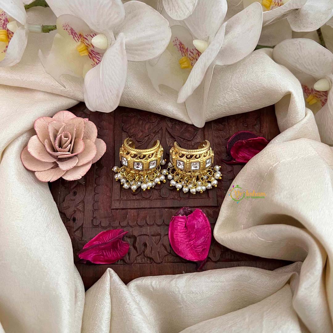 Experience the ethereal beauty of this Traditional Kundan Jadau Bugadi, a luminous creation that celebrates refined Indian jewelry heritage. This elegant mismatched pair features pristine white tones enhanced by shimmering pearl clusters and meticulously placed kundan gemstones. The jadau craftsmanship ensures each stone is individually set in gold foil, creating a captivating play of light and shadow that enhances your natural radiance. Designed for brides, festive occasions, and discerning collectors, these bugadi earrings represent the pinnacle of traditional artistry. An heirloom-quality piece that transcends trends, offering enduring elegance and cultural significance for generations to come.