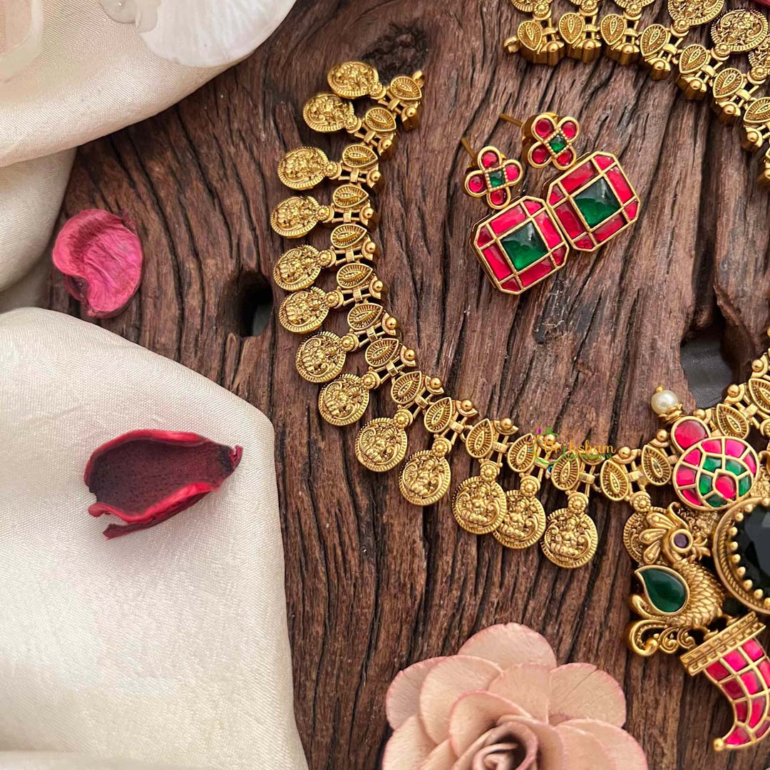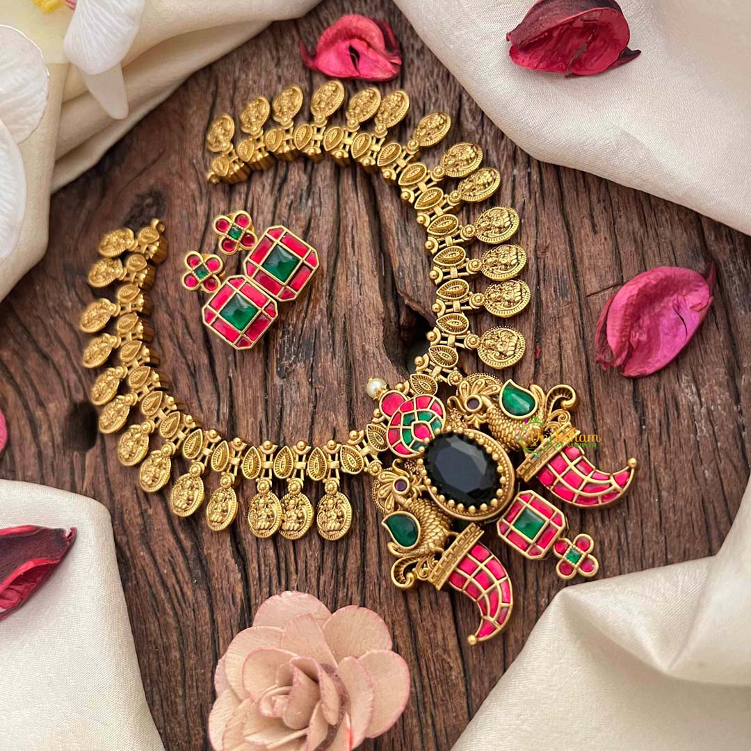 Celebrate divine elegance with this Traditional Lakshmi Coin & Peacock Temple Short Neckpiece, a harmonious blend of spiritual symbolism and artistic craftsmanship. Featuring an ornate Lakshmi coin paired with intricate peacock motifs, this piece embodies prosperity, grace, and cultural heritage. The temple-inspired design showcases meticulous detailing that honors traditional artistry while maintaining contemporary wearability. Perfect for festive celebrations, religious occasions, or those seeking to infuse their wardrobe with meaningful, culturally rich jewelry. The compact length offers comfortable everyday wear without compromising on statement-making presence. Each element is thoughtfully designed to radiate sophistication and timeless beauty.