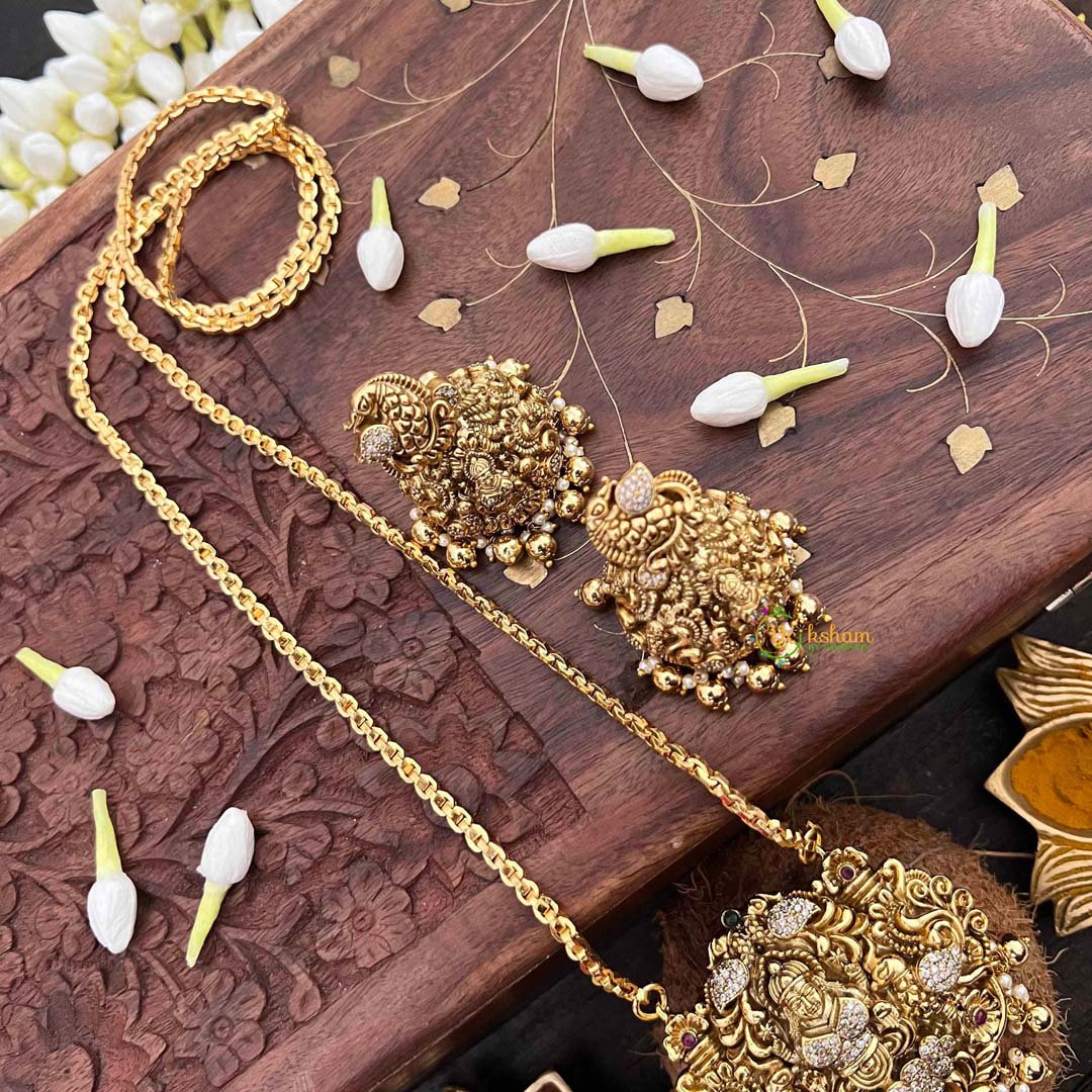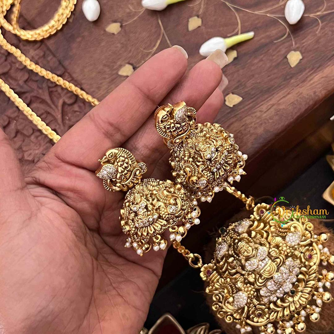 Invoke blessings of wealth and prosperity with this Traditional Lakshmi Temple neckpiece, a luminous celebration of divine grace. The AD stone pendant captures the goddess in radiant detail, suspended from a delicate chain that allows for elegant draping and versatile styling. Sparkling stones catch light beautifully, creating an ethereal glow that complements both festive occasions and everyday wear. This extended neckpiece honors temple jewelry traditions while maintaining contemporary sophistication, making it an essential piece for brides and spiritual seekers alike. Each element has been thoughtfully crafted to embody Lakshmi's benevolent presence, offering a wearable reminder of abundance and auspicious blessings.