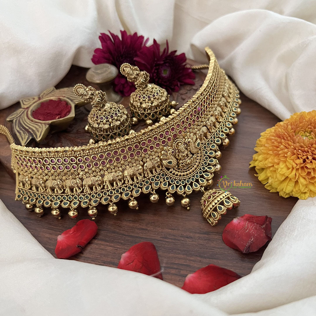 The Vriksham Traditional Lakshmi with Elephant Style High Neck Choker showcases intricate gold beadwork featuring elegant motifs of Goddess Lakshmi alongside majestic elephants. This sophisticated design blends cultural symbolism with refined craftsmanship, making it a distinguished accessory that adds timeless elegance to your traditional wardrobe.