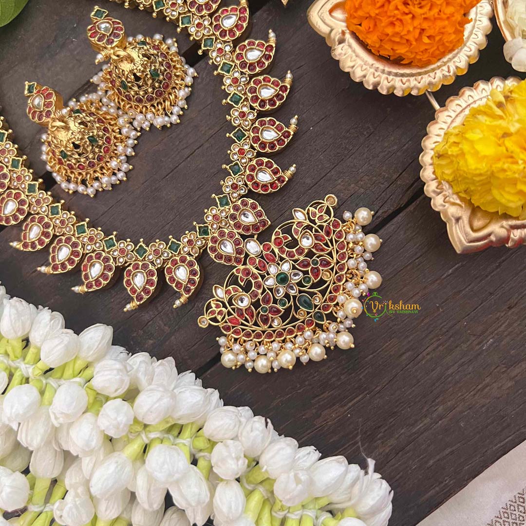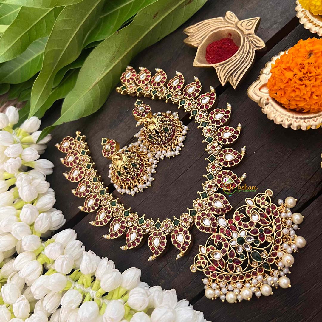 The Vriksham Traditional Manga with Floral Short Neckpiece showcases intricate floral motifs combined with classic manga design elements. This sophisticated piece reflects timeless craftsmanship, making it an elegant accessory to complement your festive or formal attire with subtle beauty and refined charm.