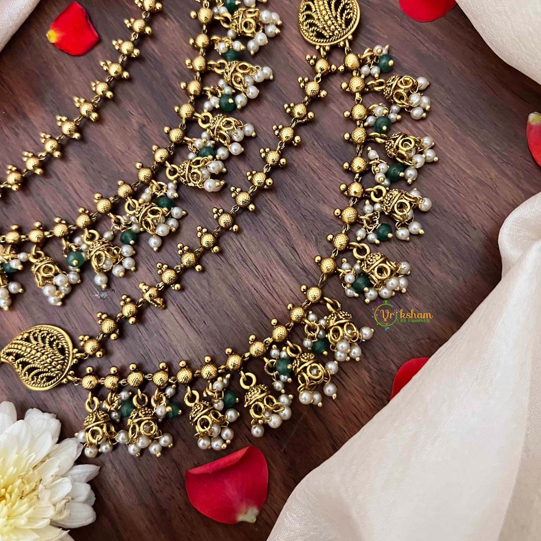 Discover timeless elegance with this stunning maatil, showcasing the revered mango motif across its graceful double-layer construction. Embellished with delicate jhumka drops, lustrous pearls, and verdant green beads, this piece weaves together traditional symbolism with refined opulence. The harmonious interplay of pearl luminescence and emerald accents creates an enchanting visual richness, perfect for weddings, festivals, and momentous celebrations. A truly exceptional accessory that honors classical Indian heritage while radiating contemporary sophistication, ideal for those who appreciate nuanced artistry and cultural significance.
