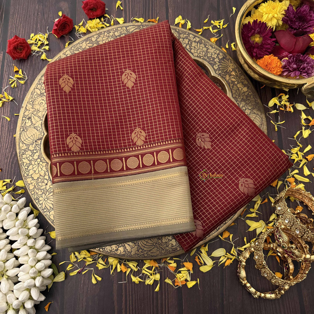 The Vriksham Traditional Maroon Kanchi Silk Saree features intricate podi kattam work accented by a rich gold zari border. Its deep maroon hue exudes classic elegance, while the gold zari detailing adds a touch of opulence. Perfect for ceremonial occasions, this saree blends timeless tradition with refined sophistication.
