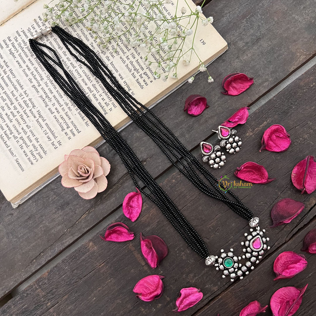 The Vriksham Traditional Nath Style Silver Oxidized Pendant Magalsutra features an intricately designed pendant inspired by classic Nath motifs, crafted in oxidized silver and paired with elegant black beads. This sophisticated piece offers a timeless blend of heritage and refined style, perfect for elevating traditional attire.