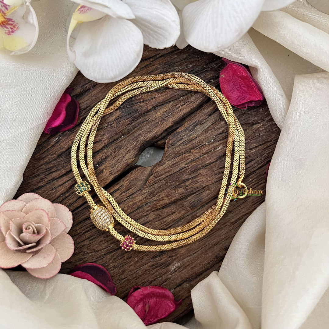 The Vriksham Traditional Oval Shape Gold Finish Moggapu Chain features a classic oval design enriched with red, green, and white accents. This sophisticated piece reflects timeless tradition and elegance, making it an ideal accessory to elevate both everyday and festive ensembles with subtle cultural charm.