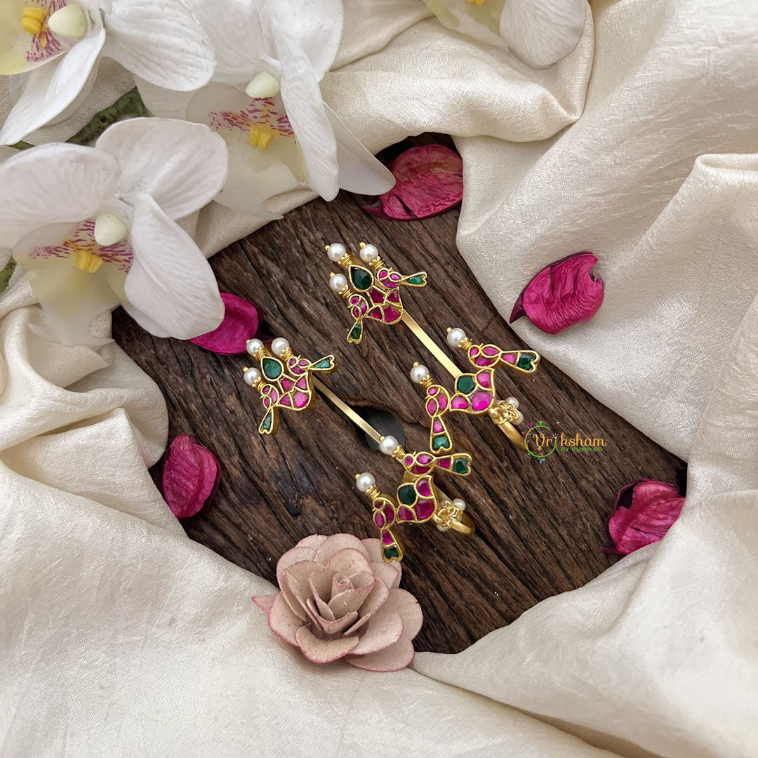 Discover timeless elegance with the Vriksham Traditional Parrot Kundan Jadau Ear Cuffs, featuring intricate craftsmanship in red and green with pearl accents. These ear cuffs showcase exquisite Kundan detailing inspired by classic motifs, perfect for adding a refined touch to your traditional attire. Their rich colors and delicate design make them an ideal accessory for festive events and celebrations.