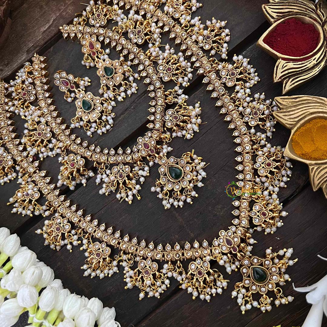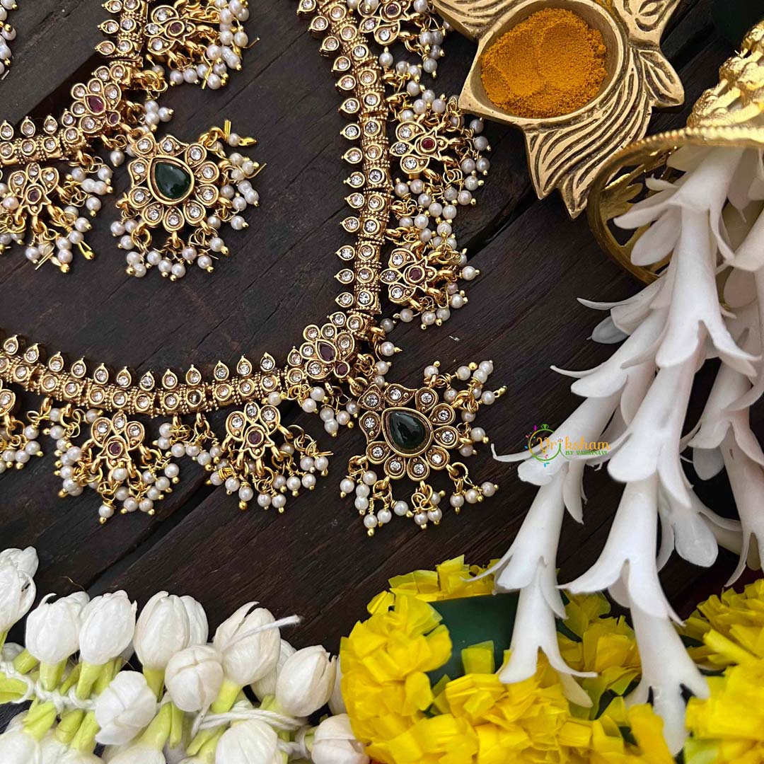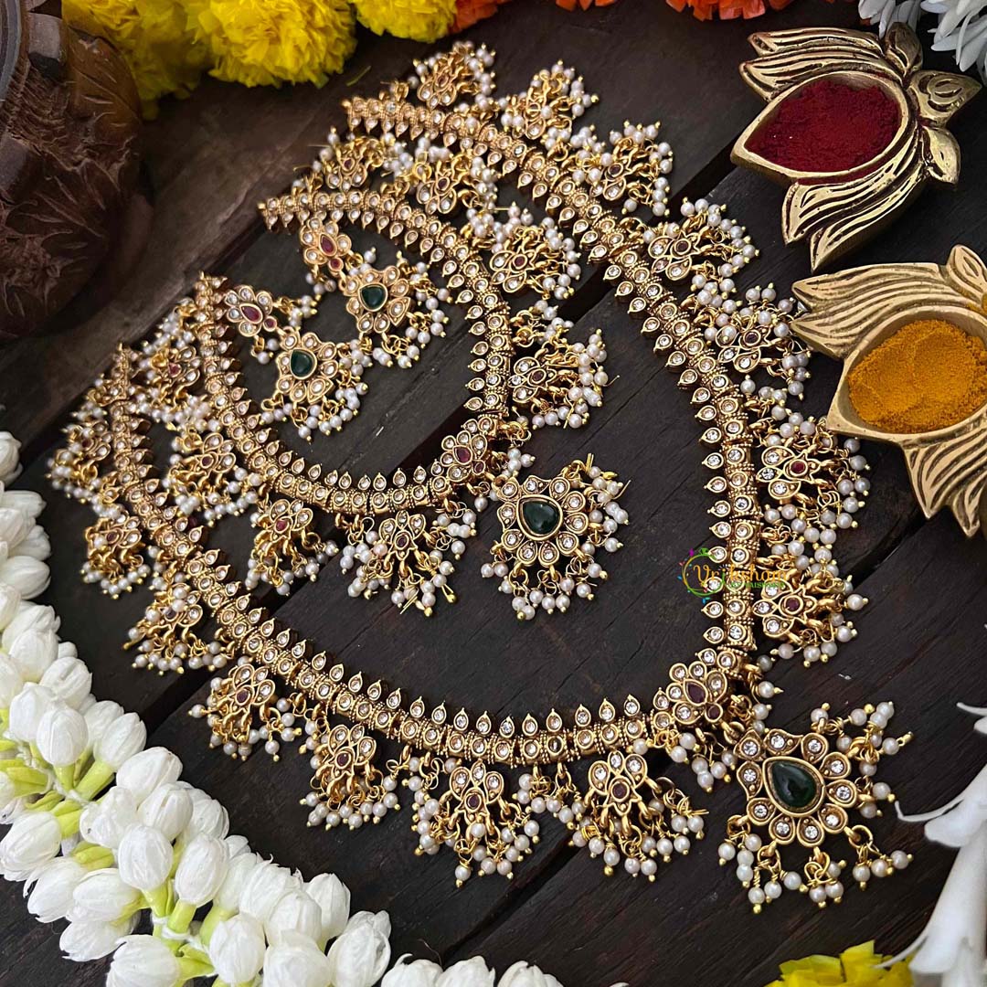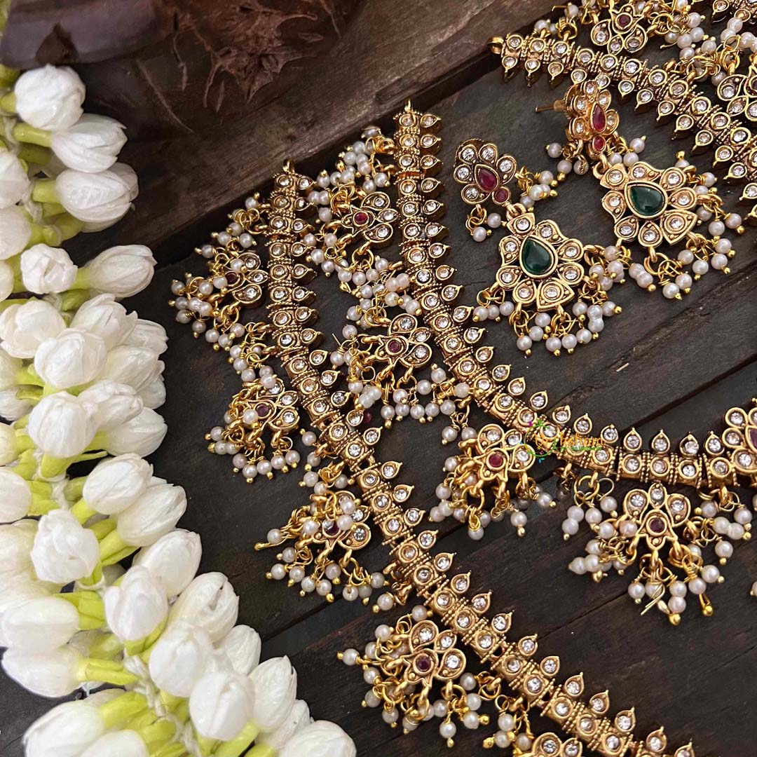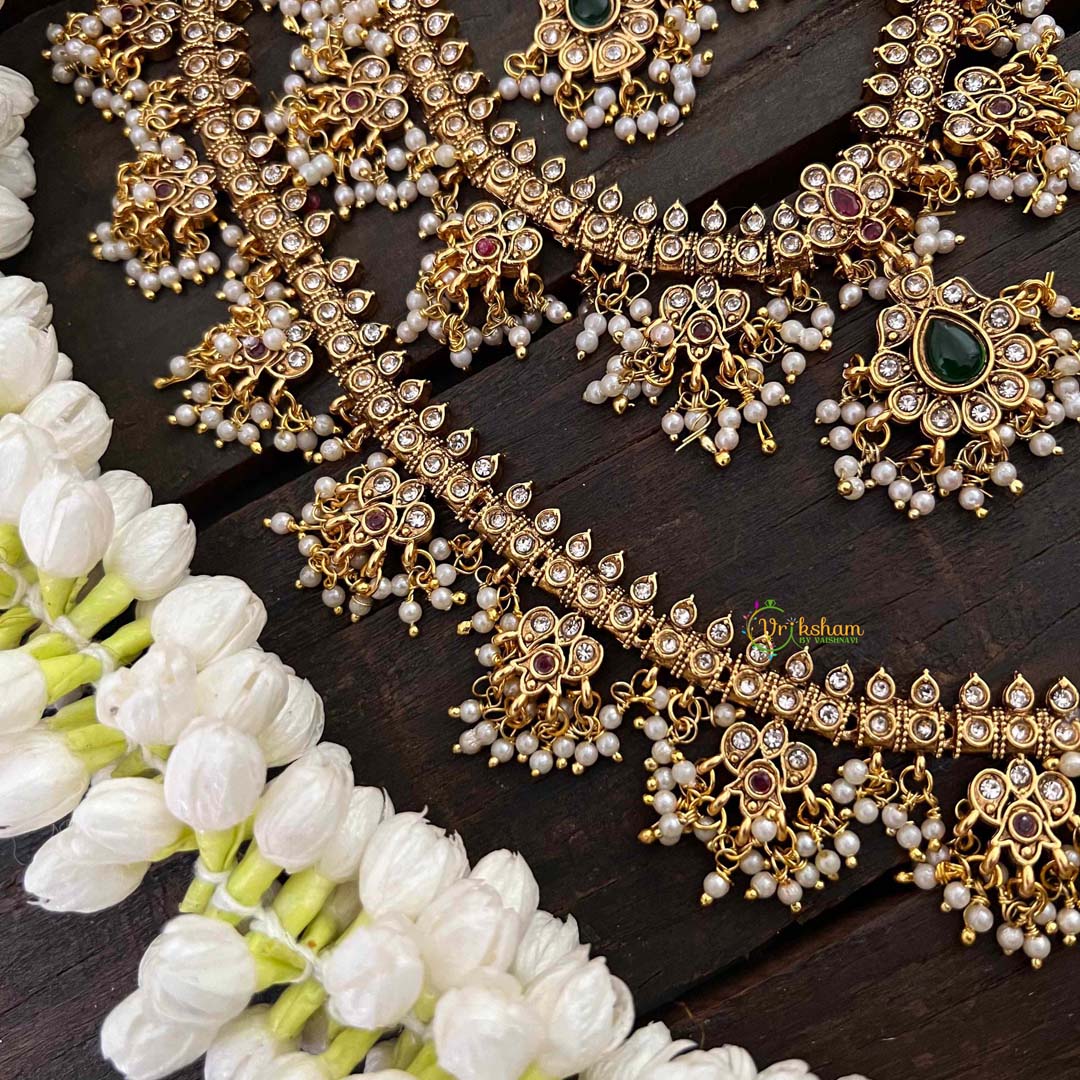 Celebrate bridal magnificence with our Traditional Pearl-Clustered Guttapusalu Bridal Set in vibrant red, green, and white. This exquisite ensemble showcases the timeless South Indian guttapusalu design, where lustrous pearls are meticulously clustered to create an opulent, cascading effect. The harmonious color palette combines deep red for prosperity, verdant green for fertility, and pure white for purity—each hue symbolizing essential bridal blessings. Crafted from premium brass metal with authentic pearl embellishments, this set offers both visual splendor and lasting durability. The traditional guttapusalu style drapes elegantly, making it perfect for weddings, receptions, and festive celebrations. Each piece in the set is designed to complement one another, creating a cohesive, regal bridal look. Ideal for brides honoring cultural heritage while embracing timeless elegance. Discover Vriksham's mastery in creating authentic bridal jewelry that captures the essence of South Indian wedding traditions.