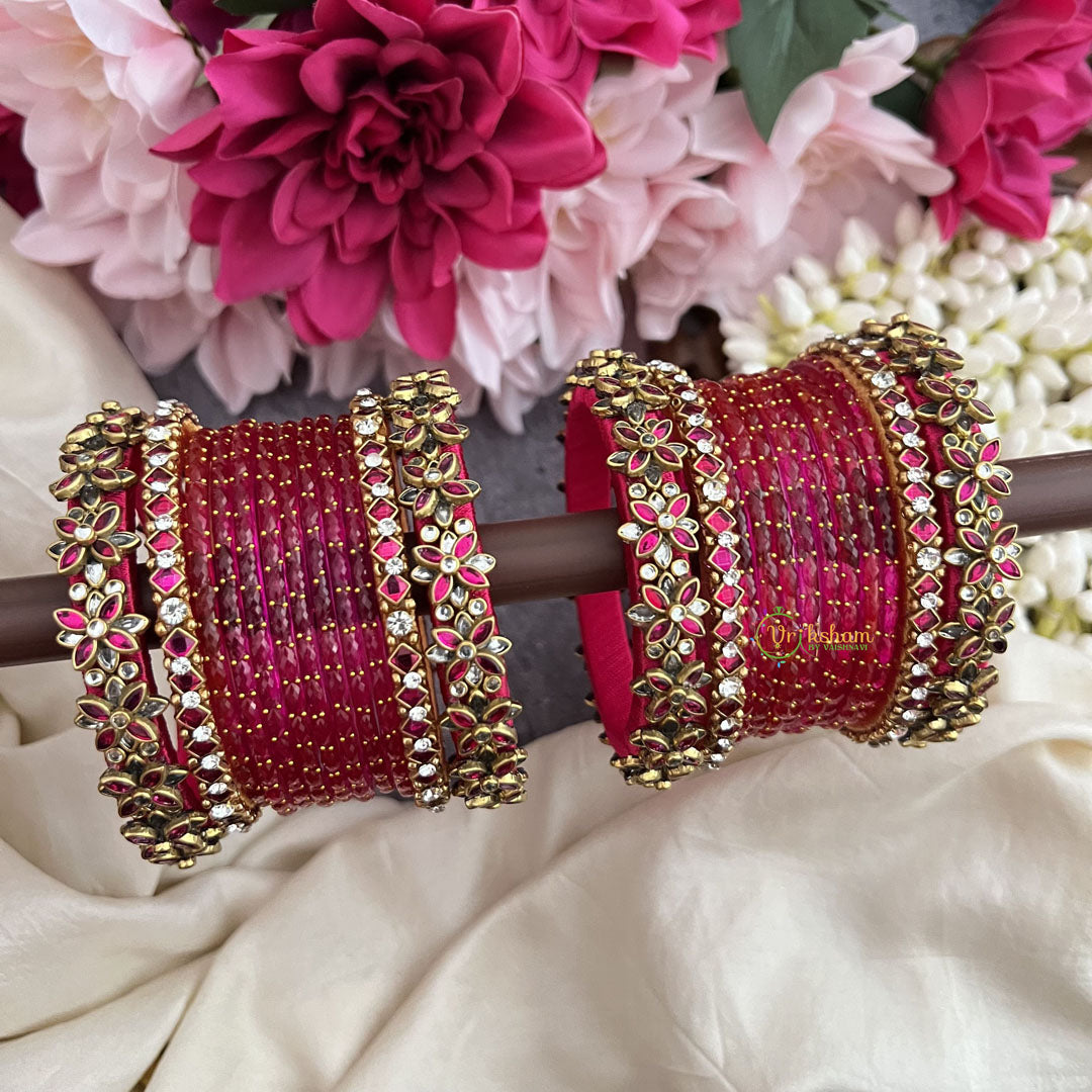 Elevate your bridal ensemble with the Vriksham Traditional Pink & Gold Bangle Set, exquisitely crafted with intricate Kundan floral detailing. This silk thread bangle set blends timeless elegance with vibrant hues, offering a refined accessory that complements traditional attire beautifully. Perfect for adding a sophisticated touch to your special day.