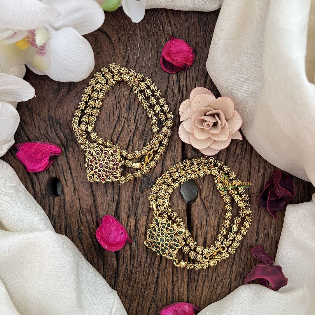 Indulge in the luxurious charm of the Vriksham Traditional Reversible Moggapu Chain. This exquisite chain features a stunning combination of red and green, perfect for adding a pop of color to any outfit. Its reversible design offers versatility, making it a must-have accessory for any fashion-forward individual. Elevate your style with this exclusive piece from Vriksham.