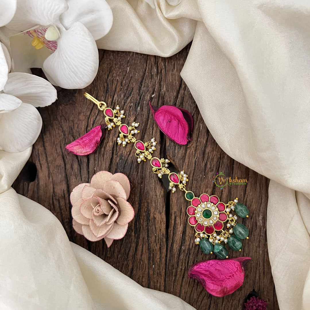 The Vriksham Traditional Round Colorful Stone Drops Kundan Jadau Maang Tikka features a vibrant round design adorned with colorful stone drops and green beads. Expertly crafted with Kundan Jadau techniques, this sophisticated accessory adds a rich and elegant touch to your traditional ensemble, perfect for enhancing your look at weddings and festive occasions.