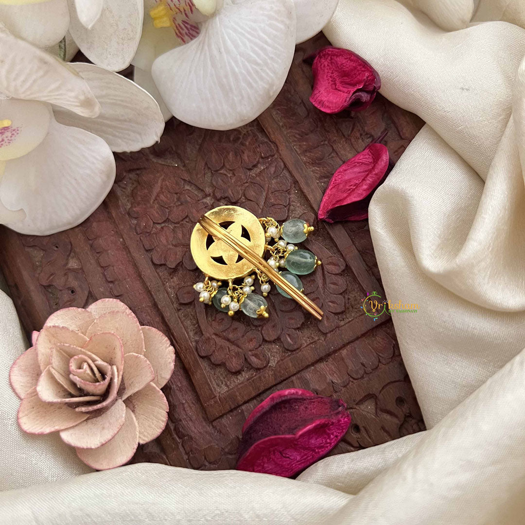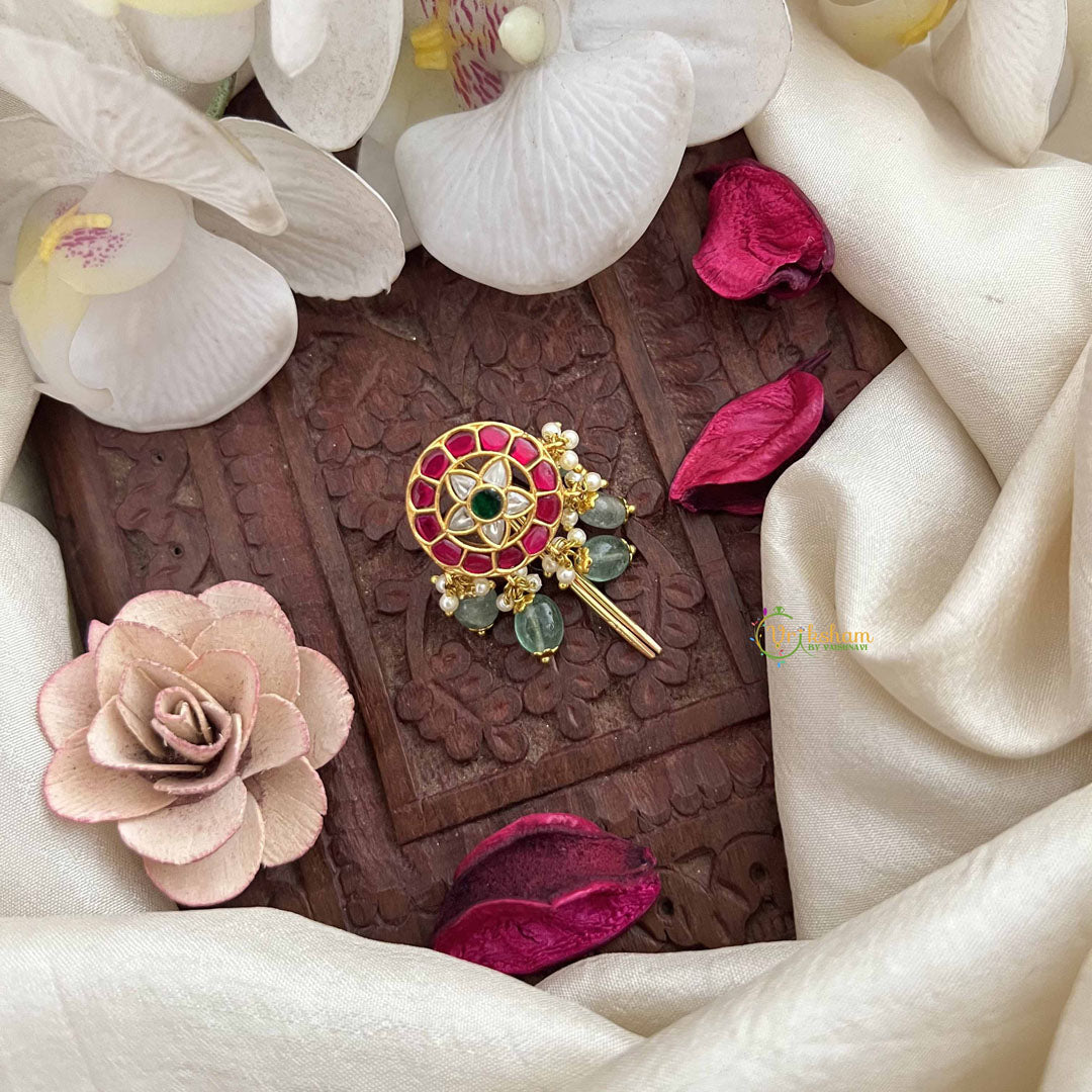 The Vriksham Traditional Round Floral Kundan Jadau Jada Billai showcases a classic round floral design, set with red, green, and white stones and highlighted by an aqua green bead. This sophisticated accessory adds an elegant touch to traditional hairstyles, ideal for weddings and special occasions. Its timeless style and meticulous craftsmanship offer lasting beauty and refinement.