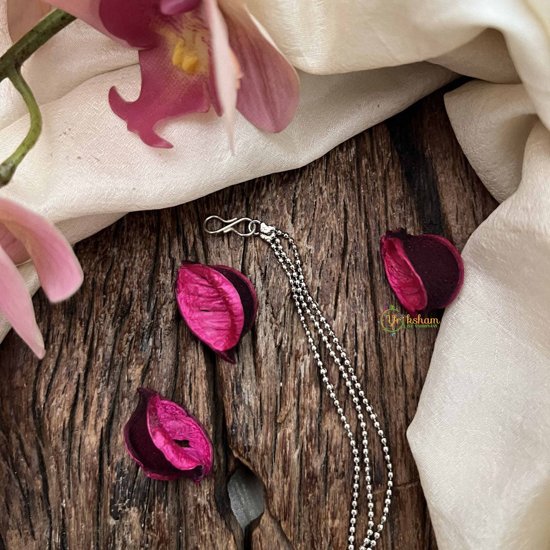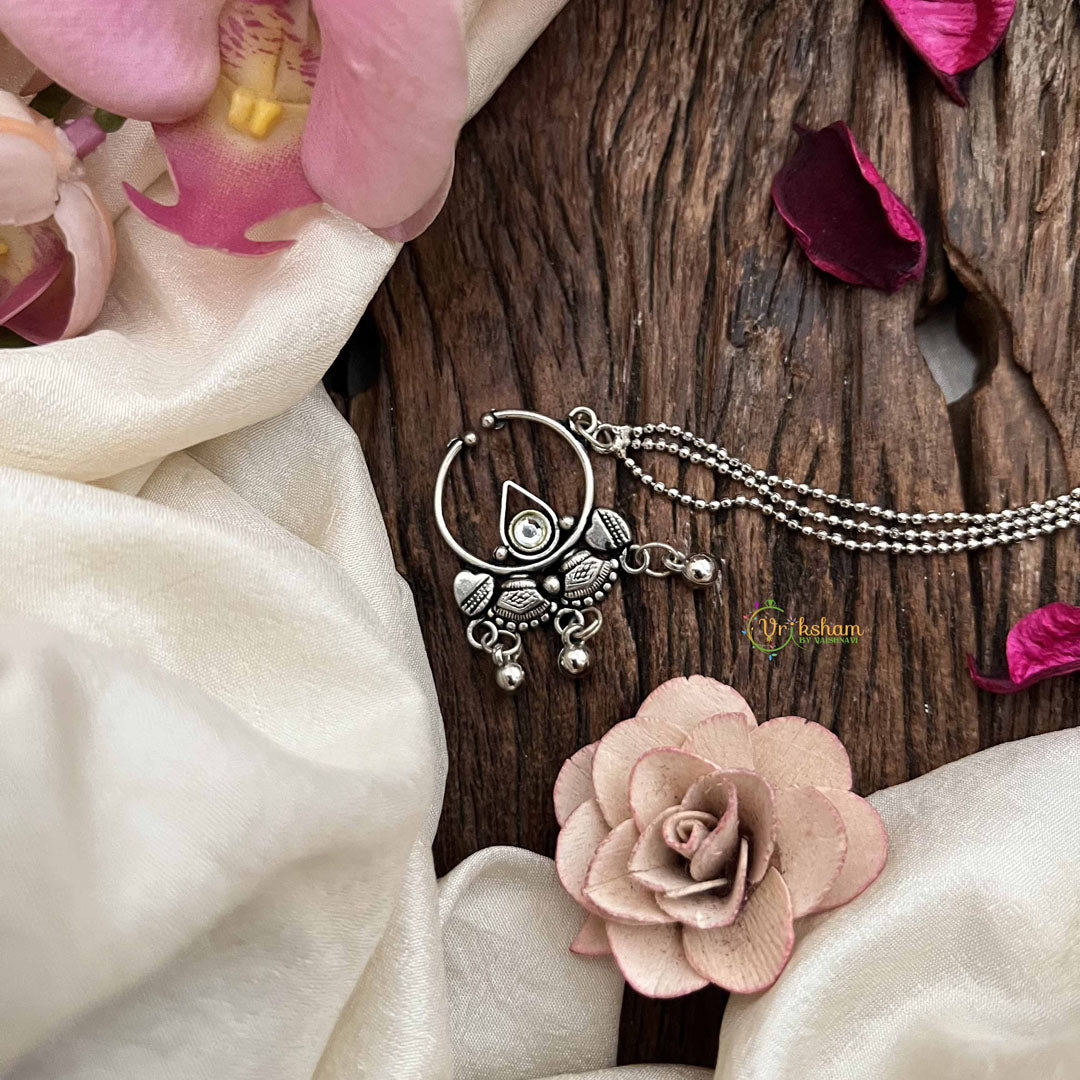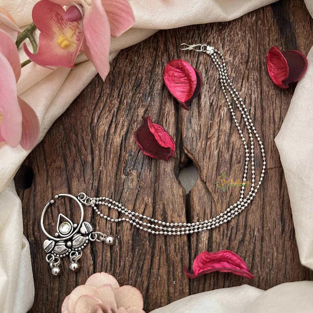 Elevate your traditional ensemble with the Vriksham Traditional Silver Nose Pin featuring a delicate 3-layered silver dot chain design. Crafted with precision, this elegant nath enhances your look with subtle sophistication and timeless charm, perfect for special occasions or everyday grace.