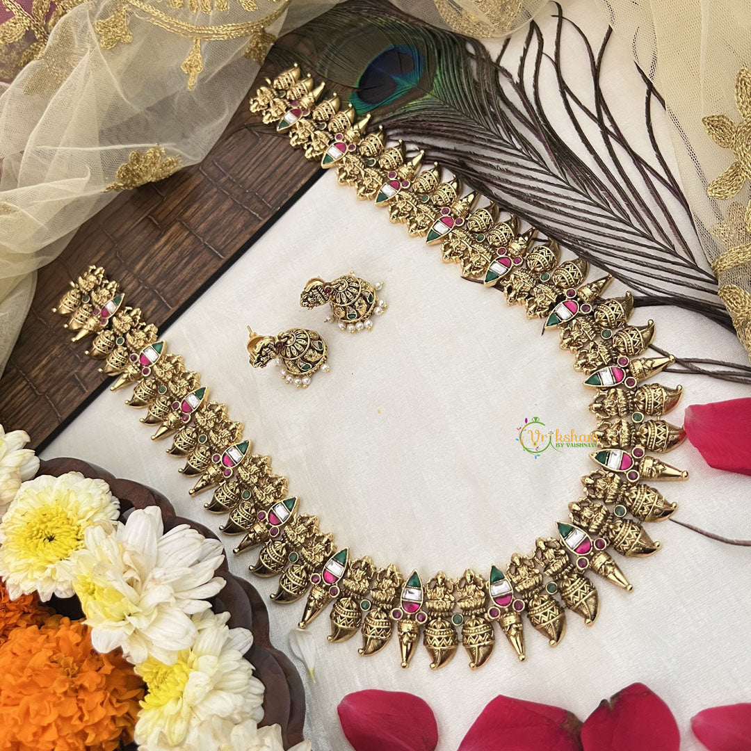 The Vriksham Traditional South Indian Gold Lakshmi Long Neckpiece features a classic Lakshmi pendant crafted in rich gold tones, embodying timeless South Indian heritage. This sophisticated long neckpiece combines traditional design with elegant detailing, making it a perfect statement piece for special occasions and cultural celebrations.