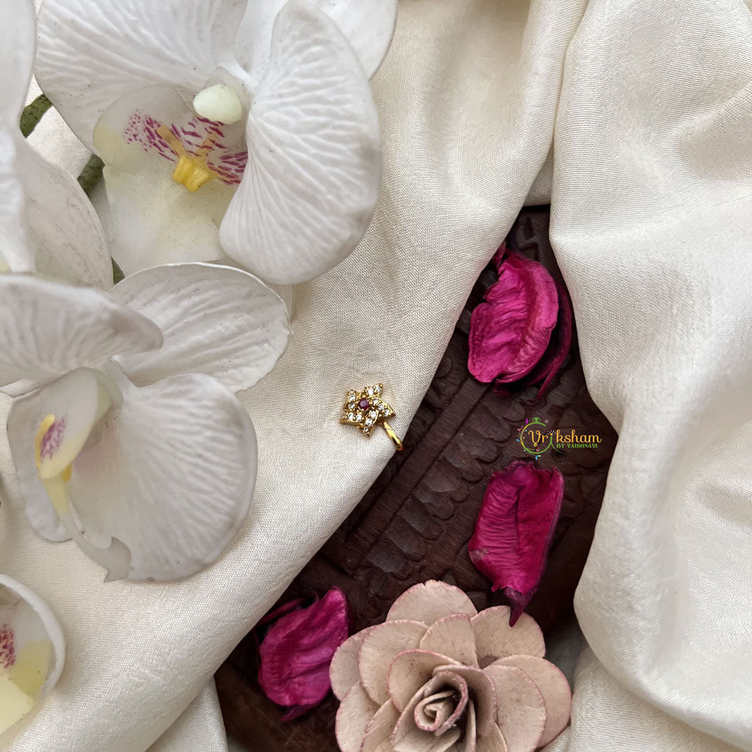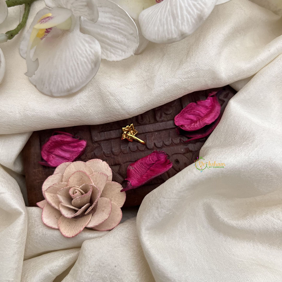 The Vriksham Traditional Star Nath features a classic star design embellished with red white stones. Its press-on style offers easy and comfortable wear, adding a timeless and sophisticated touch to your traditional ensemble.