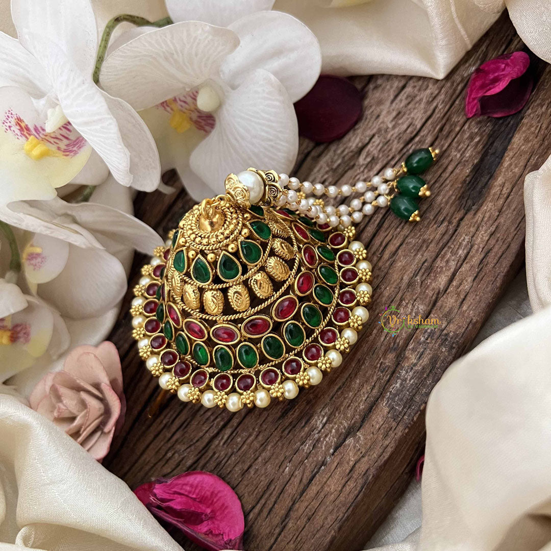 This exquisite Tamil Iyengar Andal Kondai blends traditional red and green hues with elegant pearl embellishments. Crafted to reflect cultural artistry, it enhances classical attire with a sophisticated, timeless charm. Perfect for ceremonial moments and classical performances, this piece adds a refined and authentic touch to your ensemble.