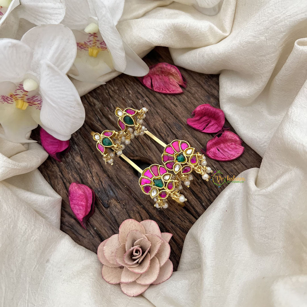 The Vriksham Traditional Temple Jadau Ear Cuffs with Pearls showcase intricate temple-inspired craftsmanship, enriched with elegant jadau detailing and lustrous pearls. These ear cuffs offer a timeless and sophisticated accent, perfect for enhancing formal and traditional looks with subtle luxury. Designed for comfort, they provide a regal statement without the need for piercings.