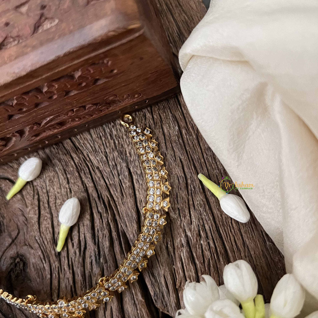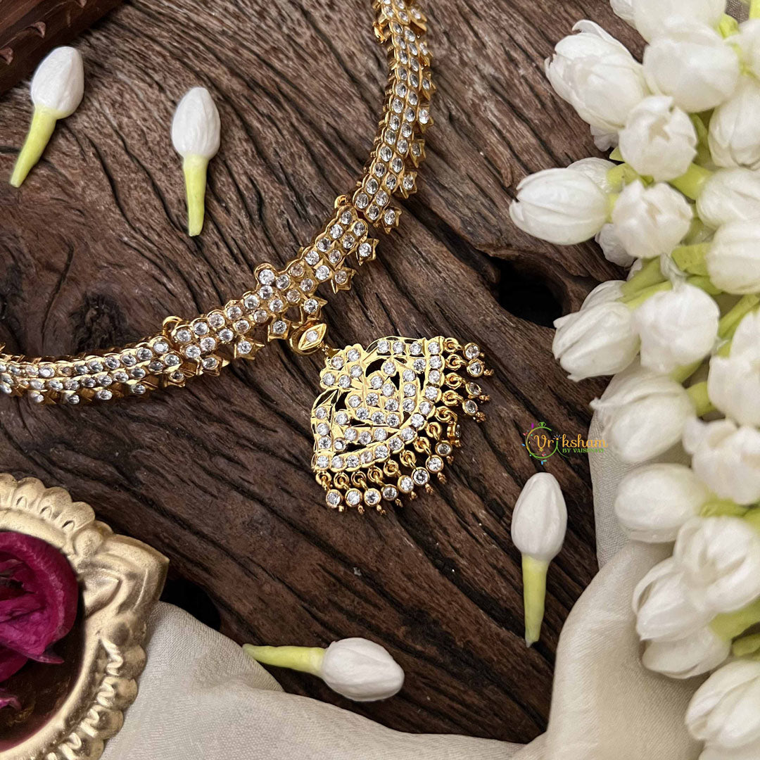 Embrace timeless elegance with this exquisite traditional white peacock pendant neckpiece. Crafted with meticulous attention to detail, the design features a majestic peacock motif adorned with shimmering diamond drops that cascade gracefully. Perfect for special occasions, weddings, or festive celebrations, this short neckpiece combines classic Indian craftsmanship with refined sophistication. The pristine white finish enhances the brilliance of the diamonds, creating a luminous focal point that complements both traditional and contemporary ensembles. An heirloom-worthy piece that captures the grace and grandeur of peacock-inspired jewelry.