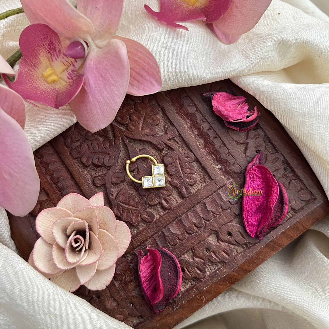 The Vriksham Triangle Style Gold-Toned Kundan Jadau Septum Ring in white offers a pristine blend of classic design and intricate craftsmanship. Featuring detailed kundan jadau set in a luxurious gold tone, this elegant piece adds a subtle yet sophisticated touch to traditional attire, perfect for elevating any cultural look.