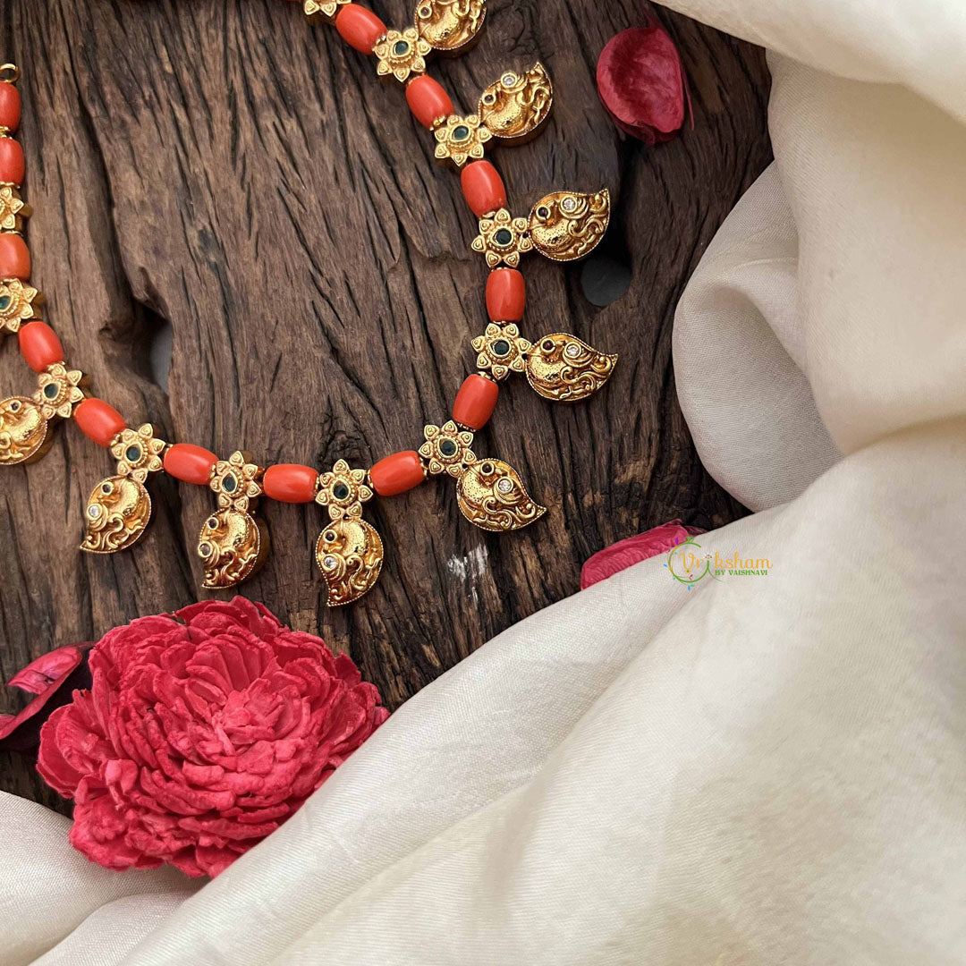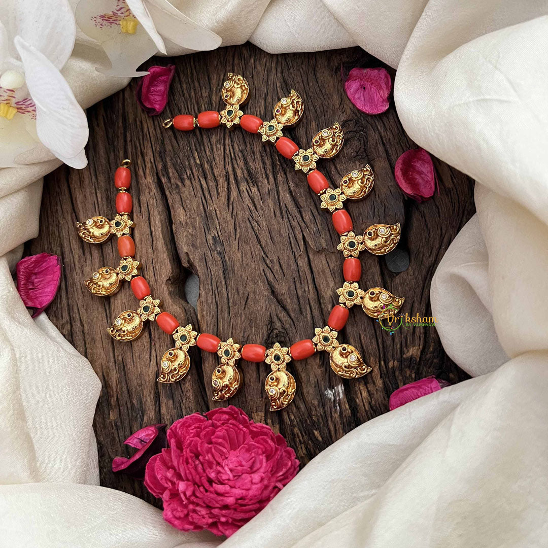 The Vriksham Tribal Royalty Coral & Gold Manga Bead Neckpiece captures the spirit of tribal heritage with a luxurious twist. Featuring rich coral and gleaming gold-colored manga beads, this neckpiece exudes regal sophistication. Its bold design complements both traditional and modern attire, making it a striking accessory for those who appreciate cultured elegance.