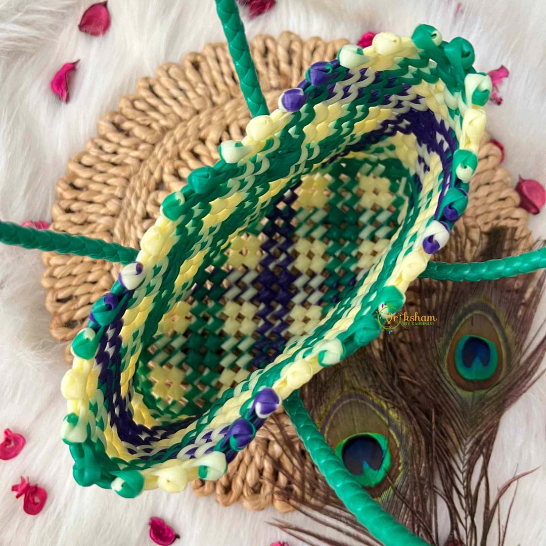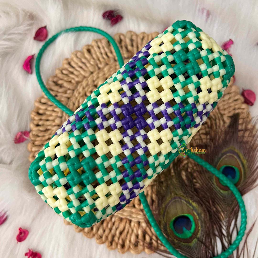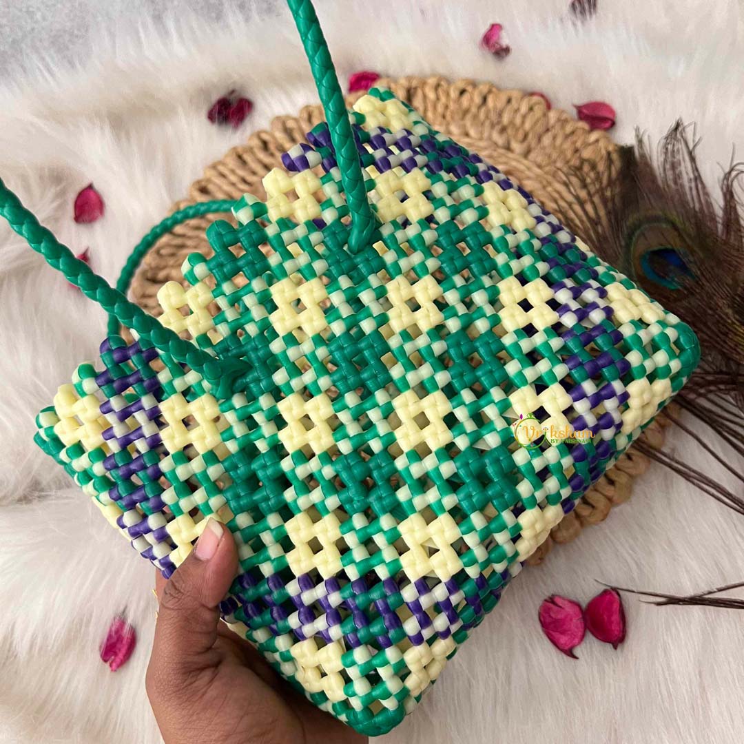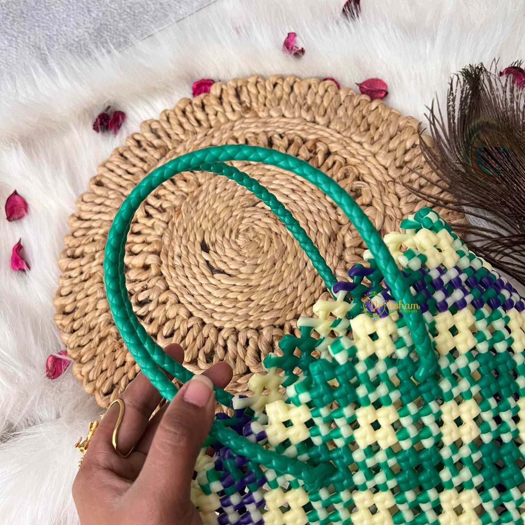 Discover timeless elegance with this artisanal hand-woven wire tote, featuring a sophisticated tri-color retro checkerboard pattern in green, white, and royal blue. The carefully curated palette combines classic restraint with subtle vibrancy, creating a versatile accessory that complements diverse personal styles. Crafted through meticulous hand-weaving techniques, each tote showcases individual character and exceptional structural integrity that endures through years of use. The generously proportioned market bag design accommodates your essentials with ease, from fresh produce to everyday items, while maintaining an air of refined sophistication. An investment in quality craftsmanship, this piece celebrates vintage aesthetics reimagined for the contemporary lifestyle, offering the discerning shopper both practical utility and distinctive style.