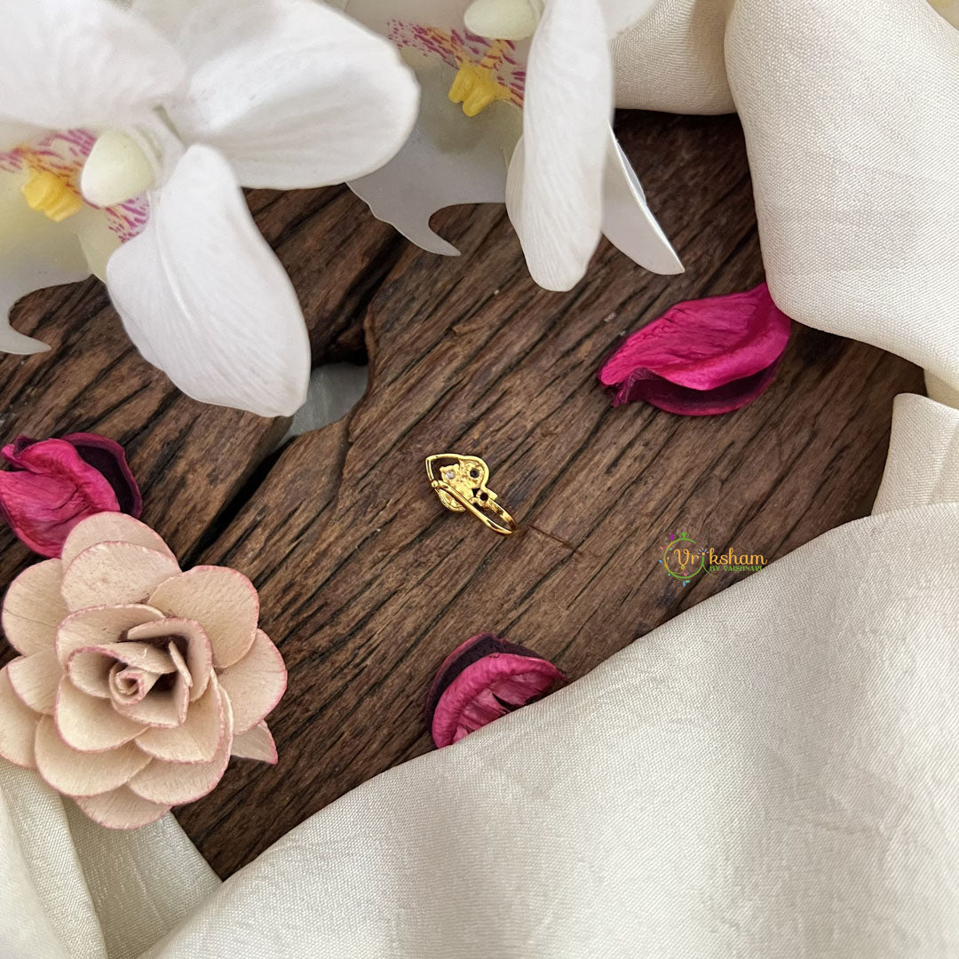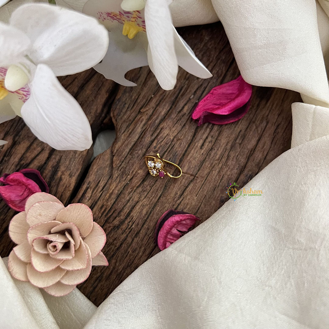 The Vriksham Trio Golden Naths in red and white features a delicate three-part design set in a luxurious golden finish. This elegant nose pin combines vibrant hues with refined craftsmanship, offering a sophisticated accessory that enhances traditional attire with timeless grace and subtle charm.