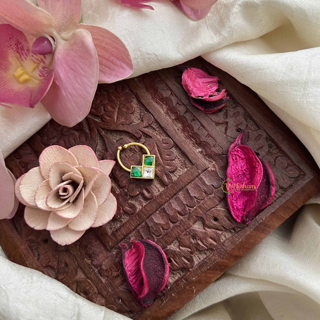 The Vriksham Triangle Style Gold-Toned Kundan Jadau Septum Ring with white and green accents showcases refined artistry. Featuring detailed kundan jadau work in a warm gold tone, this piece combines geometric elegance with subtle pearl highlights, offering a sophisticated accessory that complements traditional ensembles with grace and charm.