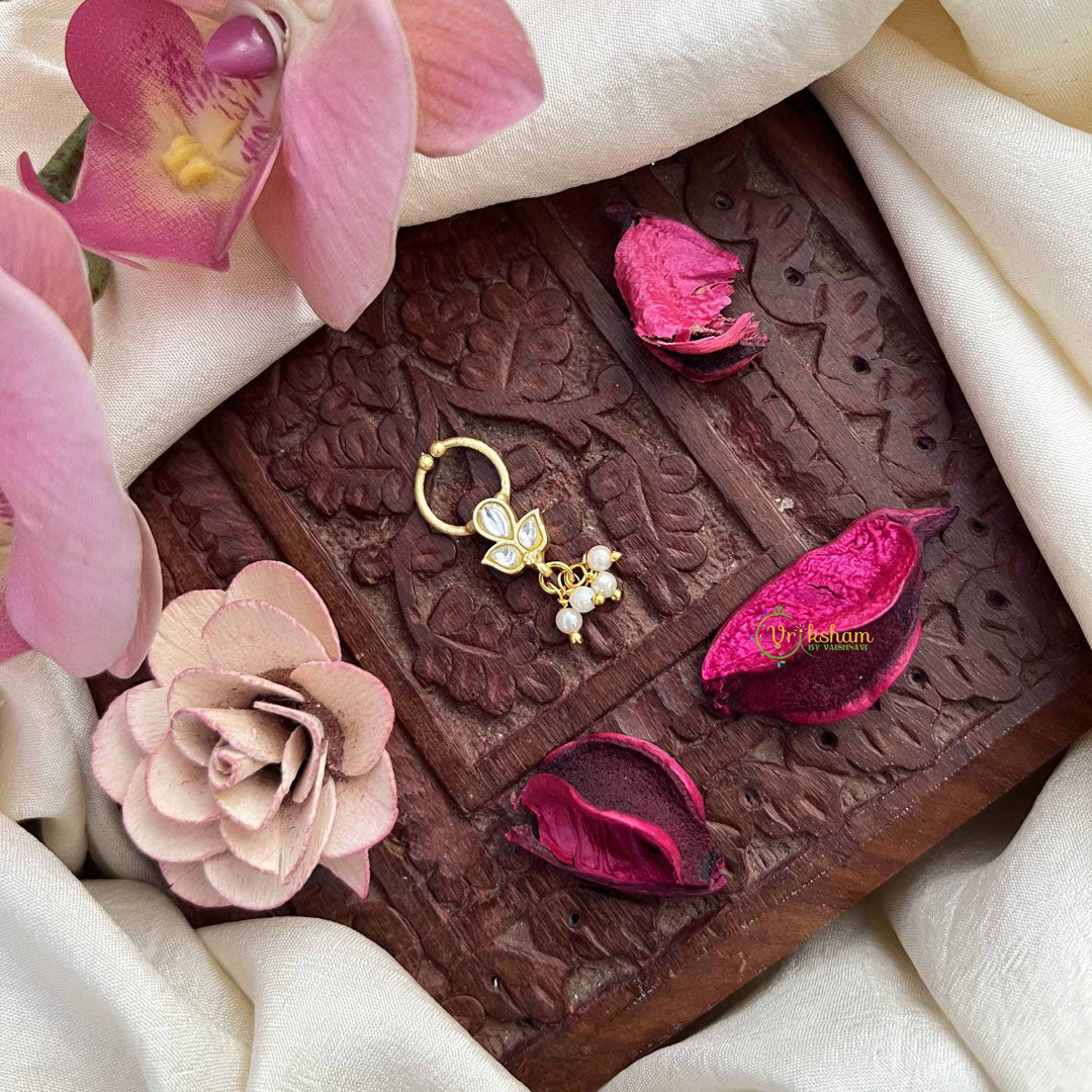 The Vriksham Trio Shape Gold-Toned Kundan Jadau Septum Ring with Pearls exudes refined elegance. Crafted with intricate kundan jadau work in a rich gold tone, it features lustrous white pearls that add a delicate, sophisticated touch. This unique piece beautifully complements traditional attire, making it an exquisite accessory for a graceful and distinguished look.