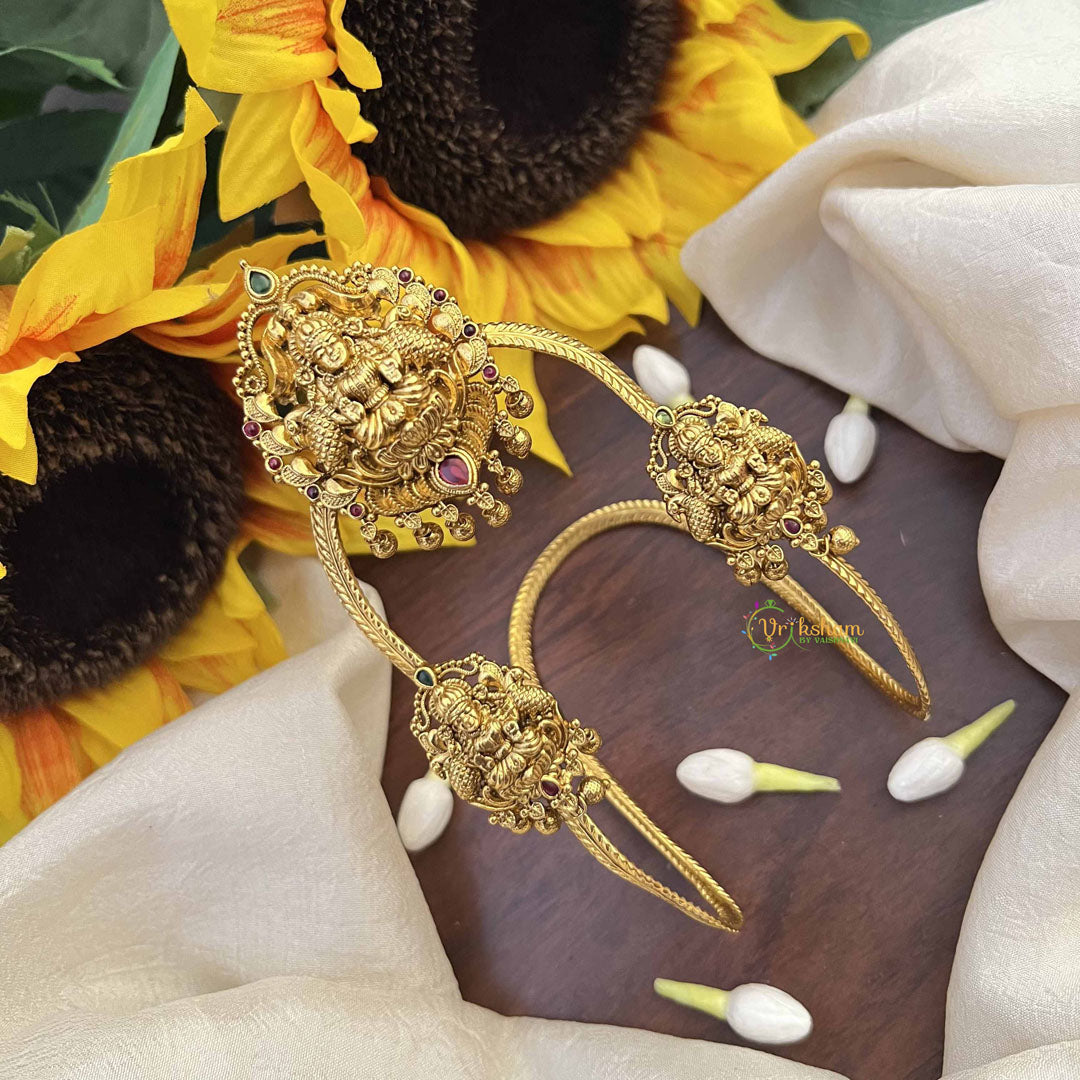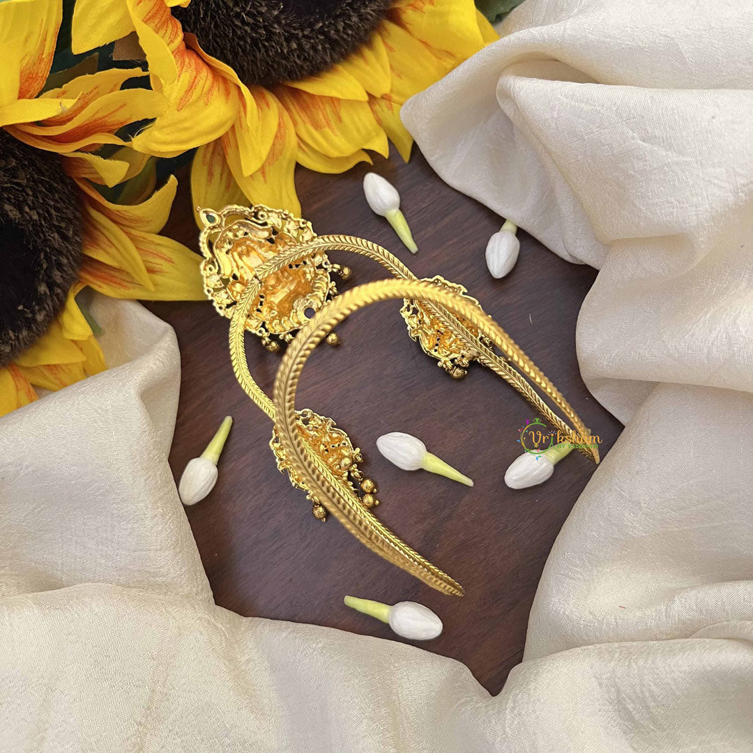 Embrace triple blessings with this Trio Style Gold Nakshi Lakshmi Vangi Temple Armlet, a harmonious celebration of divine prosperity in threefold form. Three representations of Goddess Lakshmi, meticulously rendered through intricate nakshi craftsmanship, create a powerful composition that amplifies her benevolent energy and abundance. Embellished with radiant gold beads that enhance its luminous appeal, this temple armlet authentically captures the ornamental splendor of classical sanctuary jewelry. Crafted in warm gold finish, the piece honors the sacred significance of the number three while invoking Lakshmi's multifaceted blessings of wealth, health, and spiritual fulfillment. The balanced design creates a visually captivating and spiritually potent accessory suitable for daily devotional practice or significant religious celebrations. Perfect for those seeking to deepen their connection with Lakshmi's grace through meaningful symbolism, this sophisticated armlet serves as both a stunning wearable talisman and a refined expression of cultural heritage, making it an invaluable addition to any spiritually conscious jewelry
