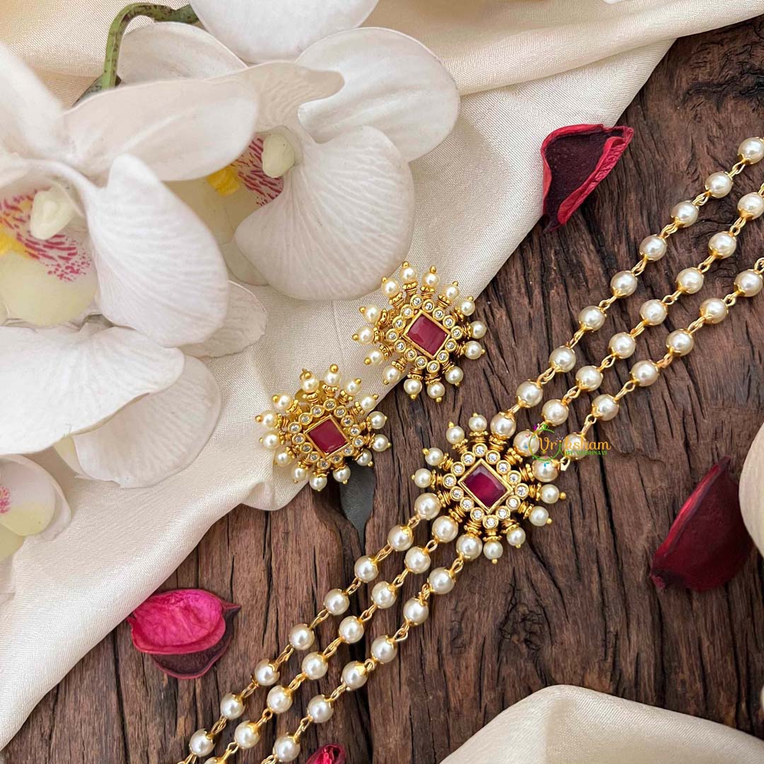 Indulge in opulent elegance with this exquisite triple-layer pearl mala choker neckpiece, crowned with a magnificent gemstone-encrusted pendant in rich red tones. The cascading layers of lustrous pearls create a luxurious, multi-dimensional silhouette that celebrates abundance and refined taste, while the ornate pendant serves as a stunning focal point adorned with intricate gemstone detailing. This spiritually inspired piece honors traditional mala craftsmanship while embracing contemporary luxury, making it perfect for special occasions, cultural celebrations, or those seeking jewelry that transcends ordinary adornment. Ideal for the discerning wearer who appreciates layered sophistication and artistic grandeur. A treasured investment that merges heritage artistry, gemstone brilliance, and timeless elegance into one unforgettable statement piece.