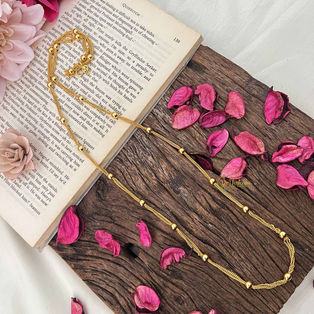 The Vriksham Triple Strand Gold Finish Chain with Beads, measuring 30 inches, combines layered elegance with intricate bead detailing. This sophisticated design adds texture and depth to your daily wear, offering a refined accessory that elevates any outfit with subtle luxury and lasting charm.