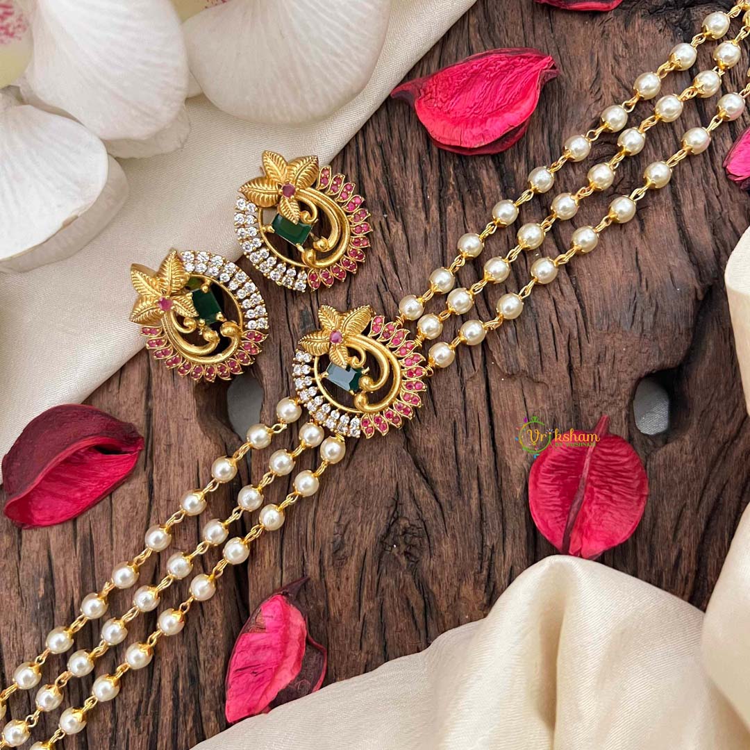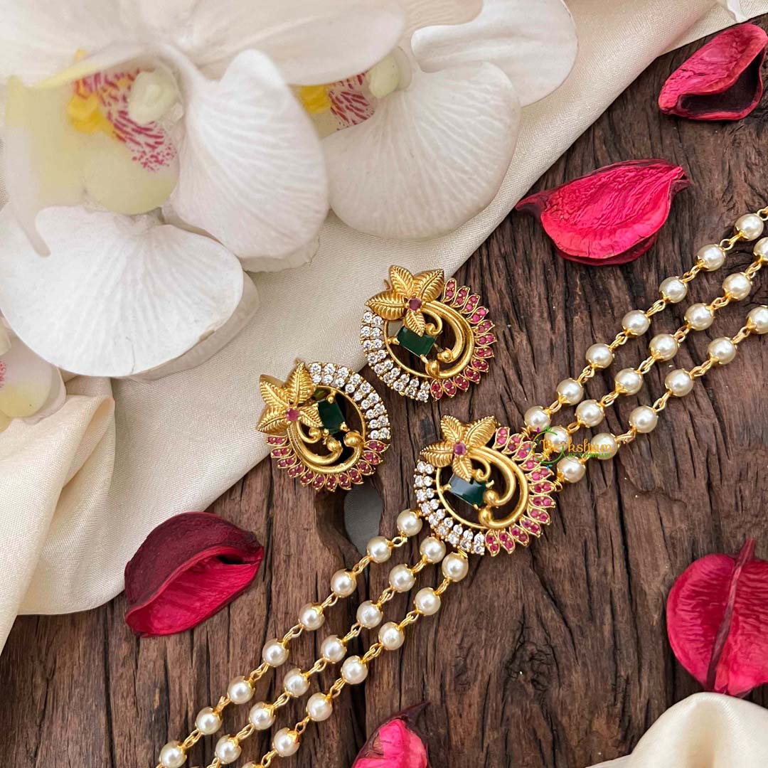Command admiration with this resplendent triple-strand pearl choker, adorned with breathtaking ruby and emerald peacock medallions positioned on the rich red right side. The sumptuous pearl strands flow gracefully, creating a multi-layered composition that exudes timeless elegance and refined luxury, while the intricately crafted peacock medallions showcase masterful gemstone artistry in vibrant crimson and verdant tones. This distinguished piece celebrates the peacock's symbolic representation of grace, beauty, and regal splendor while honoring traditional craftsmanship excellence. Perfect for grand celebrations, formal galas, or those who seek jewelry that makes an indelible impression with sophisticated artistry. Ideal for the discerning collector who values layered opulence and cultural heritage. A treasured investment that transforms any occasion into a moment of unparalleled elegance and gemstone brilliance.