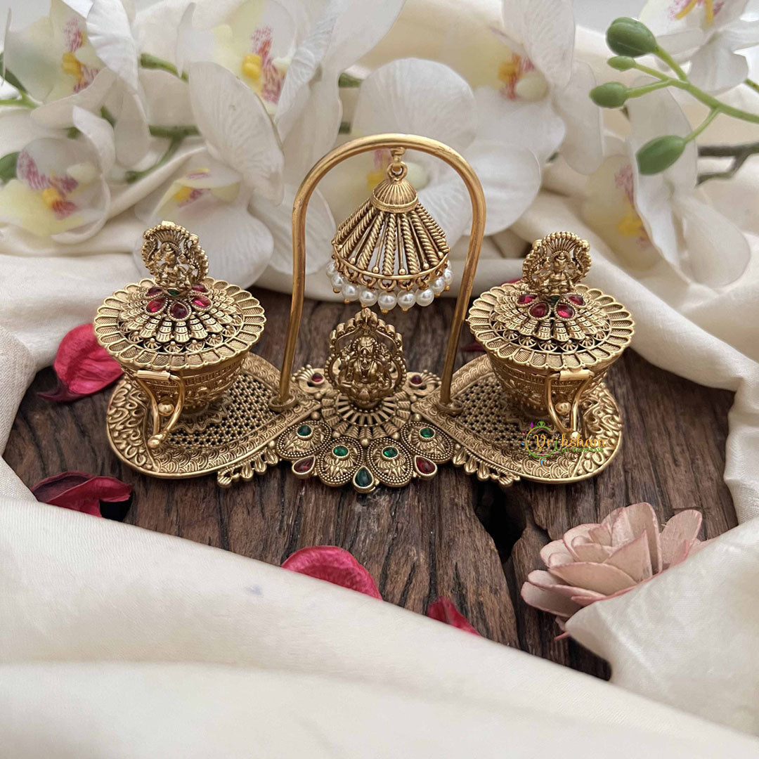 The Vriksham Twin Kumkum Box features a graceful Lakshmi idol adorned with a delicate hanging pearl canopy. This sophisticated piece combines intricate craftsmanship with elegant design, offering a refined and meaningful container for your sacred kumkum, perfect for enriching your puja space with timeless beauty.